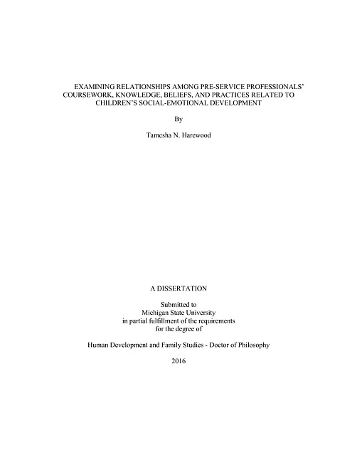 ABSTRACTEXAMINING RELATIONSHIPS AMONG PRE-SERVICE PROFESSIONALS’ COURSEWORK, KNOWLEDGE, BELIEFS, AND PRACTICES RELATED TO CHILDREN’S SOCIAL-EMOTIONAL DEVELOPMENTByTamesha N. HarewoodChildren’s early social-emotional development is important to their lifelong learning, academic success, and school readiness. With greater focus on high-quality early care experiences and increasing numbers of children enrolled in early education and care settings, the role of early childhood teachers has become more important to children’s development. However, many children enter kindergarten lacking social-emotional skills and many early childhood teachers report being unprepared to support children’s social-emotional development. Institutions of higher education provide opportunities for teachers to improve their knowledge and skills, and meet standards in the early childhood education field, which expect teachers to have knowledge of children’s development and strategies to support children’s learning and development across domains. Yet, research has only examined basic links between education and classroom quality, limiting our understanding of what educational experiences contribute to teachers’ development of knowledge and skills to work with young children. One current impediment to this line of research is the lack of existing tools to assess teacher knowledge. In the current research a tool was created to assess pre-service teachers’ knowledge of social-emotional development and its psychometric properties tested in Study 1, this tool was then used to answer more substantive questions related to teachers’ coursework, knowledge, beliefs, and practices in Study 2. These were cross-sectional studies using a convenience sample of undergraduate students at a Midwestern university in the United States. Participants included 160 students enrolled in courses through a Human Development and Family Studies department. In Study 1, the Knowledge of Social-Emotional Milestones and Support Strategies (K-SEMS) tool was determined as having two indices (the Knowledge of Social-Emotional Milestones index and the Knowledge of Social-Emotional Support Strategies Index), which were valid and moderately reliable. Study 2 found pre-service teachers who took more domain-specific coursework had more accurate knowledge of preschoolers’ social-emotional milestones and strategies, as well as higher endorsements of beliefs about expressing and support emotions in the classroom. Observing a subsample of the larger 160 participants, Study 2 also found pre-service teachers (n = 33) with more accurate knowledge and higher endorsements of instruction/modeling beliefs about emotions more frequently used developmentally supportive social-emotional practices in the classroom. These findings have implications for research, policy, and practice related to the education and development of early childhood teachers.