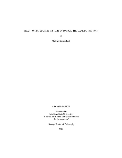 This dissertation is a history of Banjul (formerly Bathurst), the capital city of The Gambia during the period of colonial rule. It is the first dissertation-length history of the city. “Heart of Banjul” engages with the history of Banjul (formerly Bathurst); the capital city of The Gambia. Based on a close reading of archival and primary sources, including government reports and correspondences, missionary letters, journals, and published accounts, travelers accounts, and autobiographical materials, the dissertation attempts to reconstruct the city and understand how various parts of the city came together out of necessity (though never harmoniously). In the spaces where different kinds of people, shifting power structures, and nonhuman actors came together something which could be called a city emerged. Chapter 1, “Intestines of the State,” covers most of the 19th century and traces how the proto-colonial state and its interlocutors gradually erected administration over The Gambia. Rather than a teleology of colonial takeover, the chapter presents the creation of the colonial state as a series of stops and starts experienced as conflicts between the Bathurst administration and a number of challengers to its sovereignty including Gambian warrior kings, marabouts, criminals, French authorities, the British administration in Sierra Leone, missionaries, merchants, and disease. Chapter 2, “The Circulatory System,” engages with conflicts between the state, merchants, Gambian kings, and urban dwellers. Through a focus on the circulation of men, materials, debts, lorries, groundnuts, and prisoners in the colony this chapter establishes a fundamental difference between the state and capital. The state attempted to establish a regulated, measured circulation through the city which it could direct towards its own enrichment and growth. Capital, on the other hand, pushed the pace of circulation both in terms of its speed and intensity as well as the area it covered. Merchants attempted to increase their bottom lines by increasing the circulation of capital, the collection of debts, and harvests upriver. Chapter 3, “Dead Meat,” tells the story of the single most neglected residents in African cities: urban animals. The forces which assailed the bodies of urban animals were many: sanitary regulations, pesticides, commodification of their bodies, the trade in exotic animals, hunting, roundups, and hunger. Despite these challenges urban animals continued to scratch existence (and possibly more) out of the city. This chapter not only takes historians to task for writing urban animals out of African history, but it also shows how the history of urban animals in Africa might contribute to the broader historiography of urban Africans and their engagement/disengagement with the wider urban ecosystem. Chapter 4, “Politics of the Belly” takes up the history of labor in the city. This chapter attempts to focus on the places where labor, the state, and capital met. The state understood its role in this tripartite relationship as the “head” which could rationally mediate between the “hands” (labor) and the “heart” (capital). Chapter 5, “The Excretory System” deals with the waste products of the city and the efforts by the administration to banish them from sight and, more significantly, from smell. Taking up the challenge to privilege senses other than sight, the chapter uses the sense of smell to show how sanitary measures in the city were often based not on sound understandings of germ theory, but old ideas about miasmas arising from bad air (smells). The emergence of an aspiring bourgeois class in the city pushed for sanitary reform to ease their sense of smell while the administration encouraged gardening to ensure that Bathurst “blossomed like the rose.” Chapter 6, “The Nervous System,” plays off the well documented role Muscular Christianity has played in shaping the lives of youths in the West. The chapter shows how colonial officials wavered between denigrating education based on the (animal) bodies of schoolchildren as “monkey ticks” and criticizing education which ignored young bodies as filling heads full of ideas which had no outlet in the colonial setting.