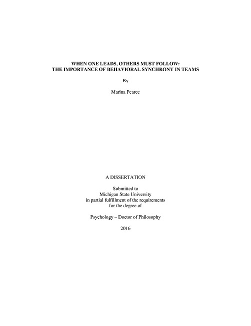 In this dissertation, I evaluate the importance of behavioral synchrony – specifically, team members following when others lead – as a primary driver of team success. Previous empirical research suggests that teams whose members engage in leading behaviors perform better, and points to the value of team members sharing in the fulfillment of leadership. Trending followership theories and qualitative research indicate that whether team members engage in following behaviors, and whether they share in the fulfillment of followership responsibilities, are equally vital for team success. Building on conceptualizations of leadership and followership as parallel, mutually interdependent processes that jointly determine team outcomes, I investigate how and why they must occur in synchrony. Drawing from published literature in social and organizational sciences, I suggest that synchrony moderates the relationship between leadership and team performance and the relationship between followership and team performance such that relationships are stronger if team members behave more synchronously with regard to leadership and followership. I embed these research questions within an input-process-outcome framework while also examining the predictors and consequences of behavioral synchrony across multiple events. Hypotheses were tested using behavioral data from teams engaging in high-fidelity emergency medical simulations. Trained research assistants coded videos of these teams, then an algorithm was applied to coded video data to determine how synchronously each team’s members worked together throughout every event. Regression analyses were used to test a reduced model positing that three key personal characteristics combine to influence team performance (average expertise, similarity in expertise, and similarity in psychological collectivism); that leadership sharing mediates the relationship between these characteristics and team performance; and that either followership sharing or synchrony moderates the relationship between leadership sharing and team performance. I discovered that average expertise and average psychological collectivism among team members were the most predictive personal characteristics. Neither shared followership nor synchrony moderated the relationship between shared leadership and team performance. Synchrony did predict team performance above-and-beyond personal characteristics, however. Ancillary analyses that focus on individuals’ patterns of behavior were conducted to further inform the questions under study – results of which indicate a need for future research to focus on the importance of following behaviors, the flexibility with which team members fluctuate between different roles throughout a task, and the balance of behaviors among team members. Limitations of this study, as well as implications for research and practice, are provided.