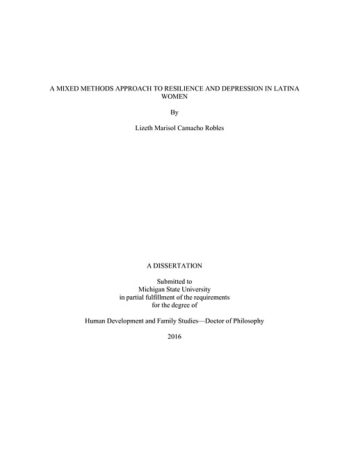 Depression is a prevalent condition worldwide and it affects women more than men (Ferrari et al., 2013). This trend is consistent in the United States (US) where women have almost twice (2.5 vs. 1.6) the rate of depression than men (Regier et al., 1993). Latina women follow this pattern; their rate of depression is almost twice that of males (Vega et al., 2004). Given that Latinas/os are the largest minority group in the U.S. (U.S. Census Bureau, 2010) and the critical role that mothers play in Latinos’ family well-being, it is imperative to address this issue. Using an integrated family resilience framework, the Relational and Resilience Theory of Ethnic Family Systems and the Familias Fuertes (Strong Families), the current project seeks to understand the risk (e.g., poverty, discrimination) and protective factors (e.g., family cohesion, belief system) that contribute to the depression experiences of Latina women. These frameworks have not been empirically tested with Latinas in the context of mental health.Using a mixed methods approach, this dissertation project examined the moderation effect of family resilience on the relationship between risk factors and depression. It also explored the role of family resilience in Latinas’ depression. The dissertation used two data sources: a quantitative data from the National Latino Asian American Study (N=1421) and a qualitative sample (N=15) of semi-structured interviews. The quantitative analysis revealed that two of the three risk factors studied predicted depression: perceived discrimination and family cultural conflict both predicted depression in women but financial strain was not a significant predictor of depression. The two moderator variables, religion and family well-being did not buffer the effect of discrimination and family cultural conflict on depression. The qualitative findings revealed five main risk factors: children’s health, family conflict and stress, financial strain, gender oppression, and racism. Two protective or family resilience themes were identified in the qualitative data: family schema (i.e., children and motherhood and religion) and patterns of functioning (social support). Based on the results, research, theory and practice implications are discussed.