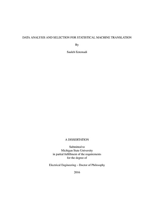 Statistical Machine Translation has received significant attention from the academic community over the past decade which has led to significant improvements in machine translation quality. As a result it is widely adopted in the industry (Google, Microsoft, Twitter, Facebook, ... etc.) as well as the government (http://nist.gov). The biggest factor in this improvement has been the availability of ever increasing sources of training data as digital multilingual communication and information dissemination become ubiquitous. Relatively little research has been done on training data analysis and selection, despite training data being the main contributor of machine translation quality.In this work, we first examine fundamental properties of translated and authored text. We introduce a new linguistically motivated feature (Part of Speech Tag Minimal Translation Units) that outperforms prior work in sentence level translation direction detection. Next, we develop a cross-domain data matrix that enables comparison between different features in the translation direction detection task. We extend our previously introduced feature for translation direction detection to use statistically trained brown clusters instead of part of speech tags. This new feature outperforms all prior work in all cross-domain data matrix combinations.Data selection in machine translation is performed in different scenarios with different objectives including: reducing training resource consumption, domain adaptation, improving quality or reducing deployment size. We develop an efficient (computational complexity and memory consumption is linear in training data size) framework for training data selection and compression called Vocabulary Saturation Filter (VSF). In our experiments we show the machine translation system trained on data selected using VSF is comparable to prior data selection methods with quadratic computational complexity. However, VSF is sensitive to data order. Therefore we experiment with different orderings of the data and compare the results.Finally, we develop a highly scalable and flexible data selection framework where arbitrary sentence level features can be used for data selection. In addition, a variable threshold function can be used to incorporate any scoring function that is constant throughout the selection process. After introducing this framework, inspired by the features we introduced for detecting translation direction, we use joint models of source and target using Minimal Translation Units (MTU) in addition to source side context using brown clusters to compare various features and threshold functions within this framework. We run end-to-end experiments using data selected by various methods and compare the statistical translation models using various test sets and phrase table comparison metrics.