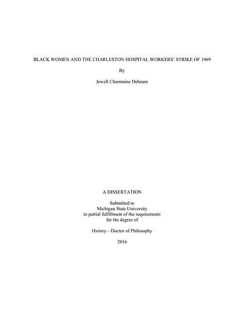 This dissertation uses archival documents, newspapers, and previously collected oral histories to construct a history of post-World War II black working-class activism in Charleston, South Carolina. I examine the women involved in one of the lesser-known events of the civil rights and black power movements, the Charleston Hospital Workers’ Strike of 1969. These women, primarily working-class and black, were central to the success of the 113-day strike. As union leaders, strikers, soup-kitchen volunteers, and national fundraisers, black women ensured the viability of the strike. Without their participation in every facet of the strike, the push for better wages, working conditions, and a union would not have had a chance to succeed. While scholarship on the intersection of labor and civil rights focuses on Rev. Martin Luther King, Jr.’s Poor People’s Campaign, specifically the 1968 Memphis Sanitation Workers’ Strike, the Charleston Strike has lingered in the background. This study argues that black women were central to the success of the Charleston strike and that their leadership in the Charleston events was unique. The Charleston strike was a women’s movement not only because over ninety percent of the participants were women, but also because women led the strike on the local and national stages.