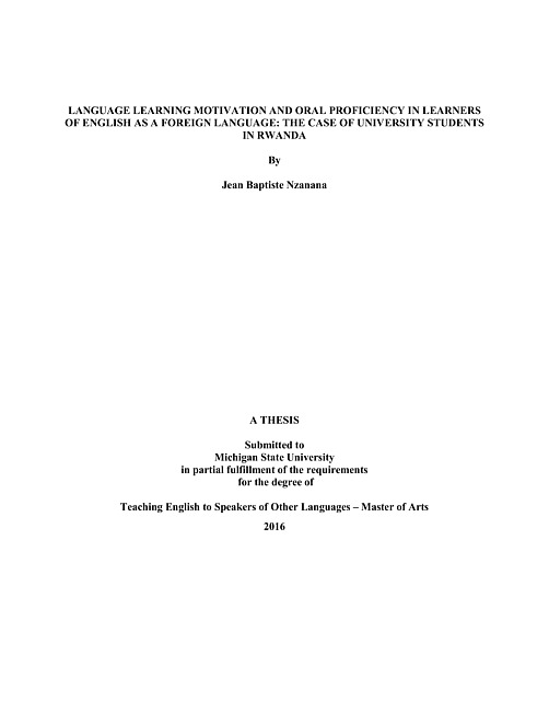 ABSTRACTLANGUAGE LEARNING MOTIVATION AND ORAL PROFICIENCY IN LEARNERS OF ENGLISH AS A FOREIGN LANGUAGE: THE CASE OF UNIVERSITY STUDENTS IN RWANDA.By Jean Baptiste NzananaBuilding on existing research on the role of motivation in language learning, the present study investigates the relationship between EFL learners’ motivation and their oral proficiency, particularly college-level EFL learners in Rwanda where there are limited opportunities for language use and exposure. The study is guided by the following research questions: What is the status of oral proficiency and motivation in university EFL learners in Rwanda; Is there a relationship between their proficiency and motivation? To what extent are they related? Data collection tools included a survey (106 students) and interviews with students (41) and teachers (3). Interviews with students were used as both qualitative data and speech samples. The latter were rated by five native speakers of North-American English for their accentedness, comprehensibility and fluency, and the results were used as oral proficiency data. Some motivation constructs as used in the literature were found to work differently for the current population, where the Ideal L2 Self and Integrative Motivation turned out to contribute to one construct identified as Integration into the Global Community. Results from the survey and interviews with both students and teachers revealed that students were highly motivated, while their oral proficiency was found to be average. Correlation analyses were run to gauge the relationship between students’ motivation to learn English and their oral proficiency. Findings revealed a weak correlation between learners’ motivation to learn English and oral proficiency. Based on results of the study, appropriate pedagogical implications and recommendations as well as avenues for future research are proposed.