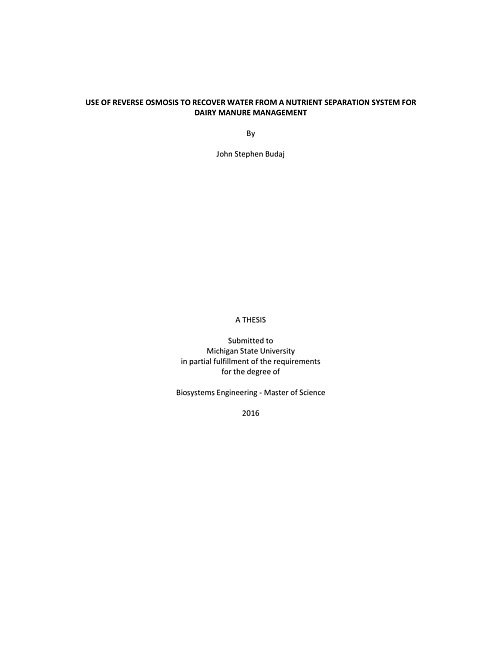 Manure storage is sometimes limited and over application of manure on fields is dangerous to the environment, especially ground water. Filtration systems using reverse osmosis (RO), are one alternative approach to reusing waste water and eliminating risk for manure spills or harming the environment. There are various challenges involved when trying to optimize this system, one of which is membrane fouling upon the RO filters. The rapid increase in pressure and reduced permeate generation due to fouling is problematic. To address this issue, antiscalant was added to the feed and the feed stream was pH adjusted using sulfuric acid or hydrochloric acid. In order to determine what foulants were present on the membrane, some of the membranes were dissected and tested using scanning electron microscopy (SEM), energy dispersive x-ray (EDX), chromatic elemental imaging (CEI), Fourier transform infrared technology (FTIR), and effervescing. Testing indicated organic and silcate scaling were present under all operating conditions. In addition, there was a greater degree of scaling using non pH adjusted feed versus pH adjusted. The use of air stripped water processed through the RO system was used for all the experiments at the pH of 5.5, 6.5, 7.5 and 8. Sulfuric acid and hydrochloric acid were used to lower the pH of the air stripped water (normal pH of 8) and the various acid runs were compared in the study. After optimizing the system, and using permeate production as a gauge, the system performed best at a feed pH of 6.5 using sulfuric acid and an appropriate dose of antiscalant, determined by the Avista Advisor modeling software. The use of hydrochloric acid was very expensive when pH adjusting versus the use of sulfuric acid for pH adjustment. Operational costs and capital costs were also determined.