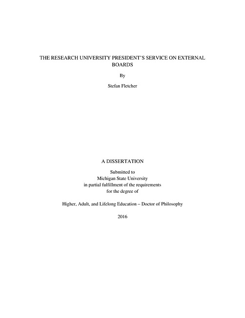 This dissertation explores and analyzes the nature of the service on external boards performed by presidents at twelve research universities. This qualitative study examines why presidents choose to serve on some boards and decline other opportunities to do so, provides insight as to the relationship between a president’s role and objectives and external board service, and illustrates various components of such board service. The dissertation then uses two theoretical frameworks to investigate how such service is both managed and perceived by a president.