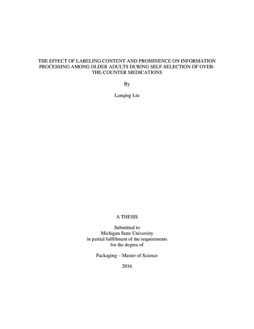 The labeling of non-prescriptions plays a vital role in presenting drug information for older patients to medicate themselves safely and effectively. Due to the current Research was needed to know how packaging and information processing influence older adults’ behaviors and decisions when selecting OTC medications. Eighty-two subjects with age older than 65 years were tested to examine the effect of labeling content and prominence, including: drug selections for appropriateness, eye tracking and health history interview. The results revealed their propensity for polypharmacy and less attention on the drug facts labels. Decision making regarding drug appropriateness was also questionable. Responses from 66 participants (80.5%) were “problematic”. And ibuprofen elicited problematic responses more than any other ingredients (p<0.0001). Also, the responses for appropriateness changed along with when the information prominent level varied. Participants with higher degree were more likely to maintain consistent in response (p=0.0165).The probability of viewing a certain information significantly depended on its drug category, prominent level and content (p=0.0027). For symptom relief and active ingredient, participants were more likely to view the prominently-featured information, while people viewed the brand name information regardless of the changes of its prominent level.