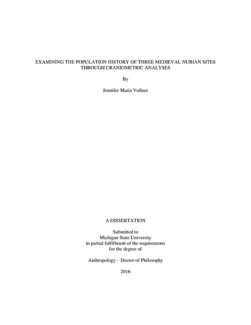 According to the common historical narrative, the area of Nubia, which in the medieval period (ca 550-1500 AD) stretched along the Nile Valley from the first cataract to the confluence of the Blue and White Nile rivers, was ruled by three separate kingdoms. While there is scant historical information on the origins of Nobadia, the northern-most kingdom, Makuria, the middle kingdom, and Alwa, the southern kingdom, many agree that the two northern kingdoms united politically to defend the territory from Egyptian rulers, while Alwa likely served as trading hub for Egypt and other merchants from the Red Sea. These newly converted Christian kingdoms eventually began to deteriorate as Arab Muslims took up residence within the region, changing the dynamics of the land. A worthwhile consideration is whether such changes in religious and political affiliation can be associated with detectable differences in the genetic makeup of the populations of this region. This dissertation examines the population history of the Nubian kingdoms through craniometric analyses carried out on samples from three sites, each from a different kingdom. A total of 25 cranial measurements are obtained from 209 individuals buried at Kulubnarti (n=89), Mis Island (n=93), and Gabati (n=27). In addition, Howells' (1973) and Spradley's (2006) African samples are used to contextualize the Nubian samples within a wider geographic region. The first focus of this research was to examine intra- and inter-site craniometric variation. No statistically significant intra-site differences were identified at Kulubnarti and Mis Island. However, there were statistically significant intra-site differences between the three time periods represented at Gabati. These differences do not support a mass migration into the region, but rather these differences likely result from change over time. The inter-site comparison of the three Nubian samples established statistically significant differences. In fact, 22 of the 25 cranial measurements differed significantly between sites. These findings suggest there was no mass migration into any of these regions, but the identified differentiation strongly suggests extra regional gene flow and/or genetic isolation. The second focus of this dissertation examines the degree of gene flow through analysis of phenotypic variance within the Nubian samples and comparison of that variation with other African samples. Results indicate both Kulubnarti and Mis Island have been relatively isolated, whereas Gabati presents evidence of extra-regional gene flow. Additionally, a comparison of the Nubian samples with other African skeletal samples shows that Gabati was more closely related to Egypt than Kulubnarti or Mis Island. This may indicate Egyptian gene flow into Gabati catalyzed by the known trade economy between those populations. Finally, an examination of the mobility of each sex within the Nubian sites shows that Kulubnarti and Mis Island males had greater mobility while the same held true for the females at Gabati. However, the sex-specific differences at each site are not statistically significant. These mobility patterns may be related to differences in cultural norms governing changes in residence for those reaching adulthood. In the end, this study adds to the unfortunately scant history pieced together from the extant historical and archaeological record of the southern Nile Valley. Thus, the most significant contribution of this research concerns where these individuals came from, populations to which they were most closely related, and the levels of extra-regional gene flow they experienced.