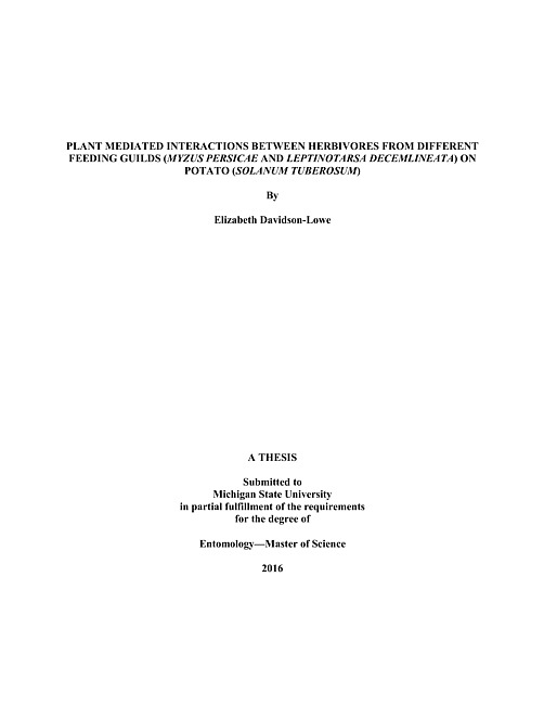 Herbivory induces defense responses in plants that alter plant traits, affecting insect fitness and behavior. Herbivores that share a host-plant can interact indirectly even if spatially or temporally distant. Jasmonic (JA) and salicylic (SA) acid play a central role in regulating plant defenses. Induction of these pathways is closely associated with the feeding guild of the herbivore. This study investigated how the co-occurrence of herbivores from different feeding guilds, Myzus persicae (Sulzer) and Leptinotarsa decemlineata (Say), could lead to differential responses in plant phytochemistry and herbivore performance and host-plant preference when feeding on potato, Solanum tuberosum L. In laboratory bioassays M. persicae performed better when feeding alone, but the presence of M. persicae did not impact L. decemlineata performance. Interestingly, when given a choice, M. persicae preferred host-plants that were damaged by L. decemlineata, while L. decemlineata preferred undamaged plants. A field study was conducted to evaluate the consequences of induced defenses due to multi-herbivory on tuber yield and whether laboratory performance results were consistent in an agricultural setting. Compared to laboratory bioassays, herbivore interactions were diminished in the field with no observed effect on yield. Differences in volatile emissions, glycoalkaloid, and JA/SA content are also discussed for each trial. Further studies investigating the qualitative and quantitative strength of feeding guild-plant interactions could provide a more thorough understanding of resistant traits and improve pest management products and practices.