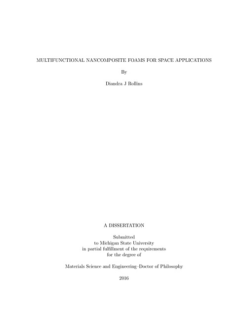 Materials combined with a small amount of nanoparticles offer new possibilities in the synthesizing of multifunctional materials. Graphene nanoplatelets (GnP) are multifunctional nanoreinforcing agents consisting of stacks of graphene sheets with comparable properties to a single graphene layer at an overall lower cost in a more robust form. Such particles have been shown to have good thermal, mechanical and electrical properties. In addition, a low density multifunctional nanocomposite foam has the potential for multiple applications and potential use for the aerospace industry. This dissertation investigates two different microporous (foam) polymers that are modified by the addition of GnP to combat this density effect to improve the foam’s macroscopic properties Three sizes of GnP with varying aspect ratio were used to improve the polymeric foams’ dielectric, electrical and mechanical properties.GnP was added to a water-blown polyurethane/polyisocyanurate (PUR/PIR) foam with a neat density of 0.16 g/cm3. The largest aspect ratio GnP percolated to form a connected network to allow for the transfer of electrons, which resulted in a decrease of the electrical resistivity by 5 orders of magnitude. This same electrical contact improved the overall dielectric properties: increased the real permittivity by over double the amount of the neat foam, increased the electromagnetic interference (EMI) shielding effectiveness (SE) by about ten times by increase the nanocomposite’s absorbance and reflectance capabilities. However, these large particles suffer from agglomerations reducing the mechanical performance even though the cell size decreased and demonstrated little interaction of the particles with the matrix by the similar glass temperature between the solid and the foam.The edge groups on the GnP were successfully treated with either polymeric or molecular isocyanate to form urethane type groups as confirmed by x-ray photoelectron spectroscopy(XPS). Edge treatment of the GnP only showed significant advantages for the smallest size of GnP with the highest edge density, and resulted in improved mechanical strength, and some improvements in the dielectric and shielding properties. These particles were also found to have the least effect on the molecular structure. The effect of treating the edges with polymeric or molecular groups was most dependent on the size of the GnP. The shorter urethane molecules that formed when reacted with toluene diisocyanate (TDI) on the edges had little to no effect on the mechanical strength, but was able to lower the electrical resistivity by about an order of magnitude over the same particle size treated using the same method but with a polymeric isocyanate. The larger particles treated with isocyanate demonstrated no improvement in the compressive strength over the neat particles and in general increased the electrical resistivity as well causing the dielectric performance to decrease in conjunction.GnP was also added to a polydimethylsiloxane (PDMS) matrix, which is commonly used in aerospace applications due to its flexible properties at low temperatures and environmental resistance. The nanocomposite with the largest aspect ratio and highest loading of particles significantly improved the real permittivity and EMI shielding properties in the X-band over the neat PDMS including the reflectance and absorbance capabilities, but the GnP still showed significant agglomerations. A syntactic foam was used to improve the percolation of the GnP by first coating the hollow glass spheres (HGS) with smaller GnP prior to adding to the matrix. Although it is unclear from the SEM images if the GnP was able to stay adhered to the particles during processing, the dielectric and EMI shielding properties of the nanocomposite syntactic foam was similar to the neat while producing a foam that was 20% lighter.
