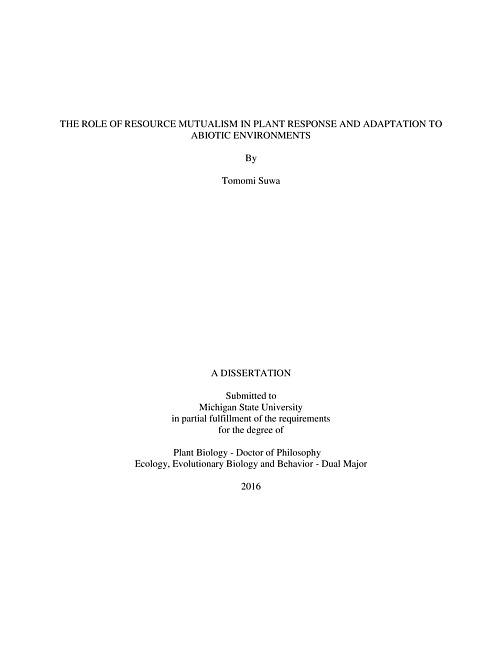 Symbiotic interactions between microbes and plants are ubiquitous in nature. These symbioses can facilitate a plant’s ability to tolerate biotic and abiotic stress. For example, resource mutualists, such as arbuscular mycorrhizal fungi and nitrogen-fixing bacteria can not only aid nutrient acquisition but also confer tolerance to drought and pH stress. Using an annual legume, Amphicarpaea bracteata, and nitrogen-fixing bacteria, Bradyrhizobium sp., as a model system, I investigated whether symbiotic microbes mediate plant fitness responses and adaptation to abiotic stressors, including soil moisture, limited light availability, and nitrogen limitations.First, using a large reciprocal transplant experiment, I demonstrated that soil moisture is likely an important selective agent driving plant adaptation. Additionally, I found that symbiotic rhizobia influence patterns of plant adaption to soil moisture. Given the intimate relationship between plants and symbiotic microbes, such as mycorrhizae, endophytes and rhizobia, such patterns may be prevalent in nature. My results also highlight the importance of examining both biotic and abiotic factors in adaptation studies.Second, because rhizobia are notoriously difficult to manipulate in the field, and to further identify soil moisture as the selective agent driving plant local adaptation, I conducted a multi-factorial greenhouse experiment manipulating soil moisture, plant genotype and rhizobia genotype (both collected from the same wet or dry sites). While I found weak evidence of plant adaptation to soil moisture, I found that rhizobia performance was strongly affected by the match between rhizobium origin and plant origin (wet or dry sites), suggesting that plant divergence across wet and dry sites results in traits that differentially benefit rhizobium genotypes isolated from wet versus dry sites.Finally I tested for plant population variation in plant response to other key selective agents on the legume-rhizobium mutualism (light and nitrogen availability). I found that plants and rhizobia responded differently to changes in resource availability. Symbiosis was most beneficial for rhizobia under high light and low nitrogen conditions, as predicted by resource mutualisms theory. For plants, however, symbiosis was beneficial in low nitrogen treatments regardless of light conditions. These asymmetric effects of both traded resources are, in part, driven by plants’ ability to control nodulation under unfavorable conditions.
