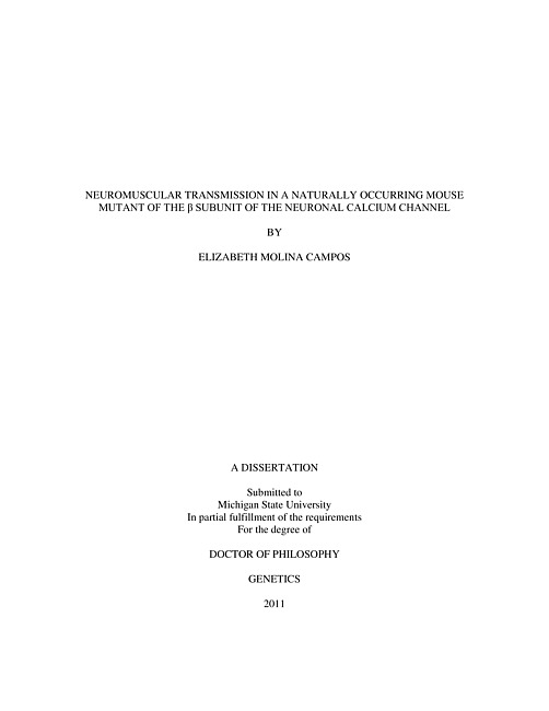 Entry of Ca2+ through voltage gated calcium channels (VGCCs) into nerve terminals is a necessary step coupling the action potential to release of acetylcholine (ACh). VGCCs are heteromultimeric complexes of α1, α2δ, and β subunits, and sometimes γ subunits. The specific α1-β combination assembled determines the channel properties. The mouse mutant lethargic (lh) has severe neurological defects due to a mutation that deletes α1 subunit interaction domain of the β4 subunit. β4 normally associates with the α1A subunit of the P/Q-type VGCCs, and has a major role in stabilizing the final α1A subunit conformation and targeting it to the cell membrane. Loss of the β4 subunit could alter the channel characteristics and localization of α1A. The overall goal of this dissertation was to test the hypothesis that disruption of the β4 subunit affects the function of the α1A subunit of the P/Q-type VGCCs. Electrophysiological recordings were performed at neuromuscular junctions (NMJs) of adult lh and wild type (wt) mice. The quantal content and phrenic nerve evoked release showed a significant decrease in lh with respect to wt. The frequency of spontaneous release of ACh also decreased significantly, although the reduction was only evident when Ca2+ was replaced by Sr2+ or Ba2+ as charge carriers. The amplitude of spontaneous release was not affected by this mutation, implying that each vesicle contains approximately the same amount of ACh in wt and lh mice. These results are due to a significantly slower process of neurotransmitter vesicles release, as confirmed by FM1-43 staining method.There are specific VGCCs antagonists that can be used to determine the contribution of the different types of VGCCs in nerve-stimulated ACh release from motor nerve terminals. ω-agatoxin IVA and SNX-482, specific antagonists for P/Q- and R-type VGCCs respectively, significantly reduced the quantal content in adult lh mice. Immunolabeling of VGCC subunits revealed an increase in α1E, β1 and β3, but no apparent change in the levels of α1A at adult lh neuromuscular junctions. Therefore, lh animals control ACh release by P/Q- and R-type VGCCs. The studies of this dissertation provide evidence for: 1) decreased nerve-evoked ACh release in lh mice, 2) slowed vesicle release process in lh mice, 3) increased level of β1 and β3, compensating for the lack of β4 subunit, and 4) P/Q- and R-type VGCC involvement in release of ACh from motor nerve terminals.