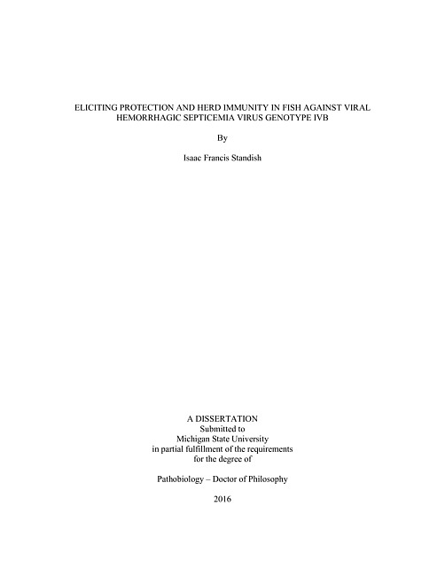 A novel genotype (IVb) of the highly pathogenic fish virus, viral hemorrhagic septicemia virus (VHSV), emerged in the Great Lakes basin more than a decade ago. Over time, VHSV-IVb has spread throughout the basin, evidenced by mass mortality events involving numerous fish species. With a common goal of learning more about this emerging freshwater genotype, researchers and managers united to investigate pathogenicity, host range and the comparative susceptibility of Great Lakes fishes. However, there remains a lack of knowledge on the host immune response against VHSV-IVb and are still no approved preventative measures against this virus. This dissertation seeks to address these knowledge gaps and investigate protective measures for eliciting immunity against VHSV-IVb. My studies focused primarily on muskellunge (Esox masquinongy) due to their high susceptibility and vigorous immune response following VHSV-IVb exposure. To elucidate the role of the muskellunge humoral immune response against VHSV-IVb, I first developed a monoclonal antibody (mAb), designated 3B10, against muskellunge immunoglobulin (Ig). The development of the 3B10 mAb allowed for the creation of a muskellunge-specific indirect ELISA to detect anti-VHSV antibodies. I demonstrate the use of this indirect ELISA assay in both a serosurveillance capacity to determine previous viral exposure and to study the humoral immune response following immunization. Following immunization with a DNA plasmid containing the VHSV glycoprotein (G) gene, muskellunge anti-VHSV binding antibody levels peaked after approximately seven weeks. Knowing that the VHSV-IVb G gene can indeed elicit antibody production, I then compared the protective efficacy of two plasmids, differing only in their promoter sequence. One preparation (designated pVHSivb-G) conferred significant protection in muskellunge, resulting in 95% mean relative percent survival (RPS) following a single intramuscular administration, while the other (designated pβ-VHSivb-G) conferred less than 25% mean RPS. However, I found that immunized-protected muskellunge could still harbor and shed VHSV following viral challenge. Building from these results, I showed that the pVHSivb-G preparation could also elicit significant protection in three salmonid species: rainbow trout (Oncorhynchus mykiss), brown trout (Salmo trutta) and lake trout (Salvelinus namaycush). Following these successes with the pVHSivb-G preparation, I examined whether recombinant technology could provide similar protection. I expressed and purified a eukaryotic VHSV glycoprotein in cabbage looper (Trichoplusia ni) larvae using a recombinant baculovirus. After confirming the correct three-dimensional shape of this recombinant glycoprotein, the protective efficacy was assessed in muskellunge and resulted in 80% mean RPS. The culmination of my studies used the successful vaccination regimen and assays that I developed to investigate whether immunized fish can provide indirect protection to naïve fish. To accomplish this, I designed a flow-through system utilizing viral shedding as the viral exposure source. Co-mingled immunized muskellunge indeed conferred indirect protection to naïve muskellunge, resulting in a decrease in mean mortality from 80.2% to 36.5% when compared to naïve muskellunge housed alone. No protective effect was observed when naïve muskellunge were housed with Chinook salmon (Oncorhynchus tshawytscha), a semi-resistant species, indicating that immunity rather than resistance is important in this protective effect. The end result of this dissertation is an increased knowledge of the immunity against VHSV-IVb, as well as repeatable methods for eliciting this immunity.