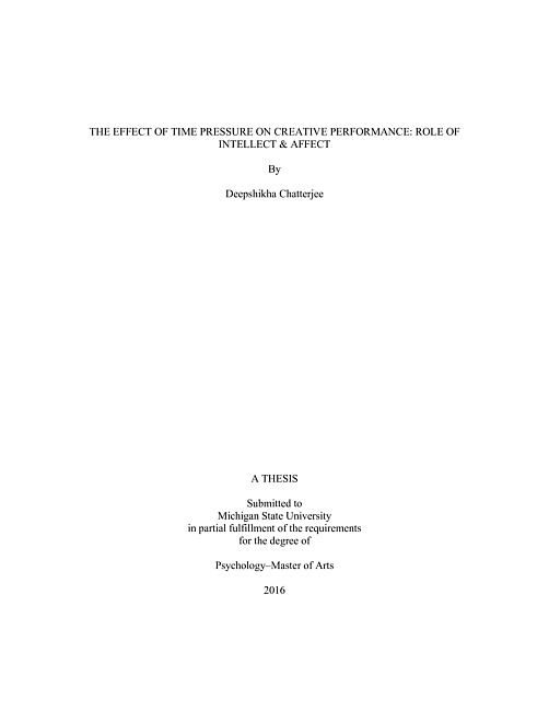 Organizations often assume that creative performance can unfold under time constraints; however, creative performance literature has tended to theorize time pressure as a stressor that inhibits creativity. The current study was proposed to understand whether or not individuals can be creative under time pressure, and to study the role of affective states as mediators in the relationship between time pressure and creative performance. Intellect, a facet of Openness, was examined as a moderator in this relationship. Results showed that Intellect failed to moderate the relationship between time pressure and affect. Furthermore, when creative performance was studied as creative performance behaviors and creative outcome effectiveness, differential findings emerge for key relationships. Negative affect, but not positive affect, mediated the relationship between time pressure and creative outcome effectiveness, but neither negative nor positive affect mediated the relationship between time pressure and creative performance behaviors. In addition, while high-perceived time pressure was related to negative affective states, it was not related to reduced positive state affect. Additionally, positive affect, as opposed to negative affect, was related to higher quantity and quality of ideas generated. Together these findings show that there is an indication that the effects of time pressure on creative performance vary depending on the type of affective state induced by time pressure. These results further shed light on the mixed findings in affect and creative performance literature and highlight the importance of studying process mechanisms rather than just limiting ourselves to an understanding of main effects.