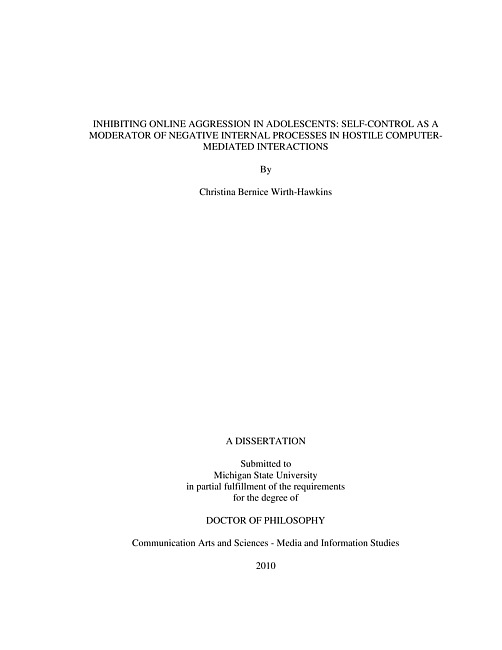 ABSTRACTINHIBITING ONLINE AGGRESSION IN ADOLESCENTS: SELF-CONTROL AS A MODERATOR OF NEGATIVE INTERNAL PROCESSES IN HOSTILE COMPUTER-MEDIATED INTERACTIONSByChristina Bernice Wirth-HawkinsPreliminary research on cyberbullying has adequately presented online aggression as a destructive adolescent behavior of growing concern. It is now time to move beyond existing descriptive findings toward empirically-based, theoretically rich studies that help to shape systematic and predictive understandings of the behavior. The present research examines aggressive Internet behaviors of high school students from the General Aggression Model's (GAM) theoretical perspective. Participants were exposed to an anger-inducing provocation scenario with one of three behavioral stimulus conditions (anti-aggressive, aggressive, or control), in which they were bullied by a fictitious classmate through an online social-networking site. As expected, the anti-aggressive stimulus significantly curtailed state hostility in relation to the aggressive stimulus. However, the anti-aggressive behavioral stimulus did not significantly impede cognition. Trait and state self-control surfaced as important potential additions for the GAM. Trait self-control significantly moderated the negative effects of discomfort and arousal on aggressive behavioral intentions, such that adolescents with higher levels of negative internal states were less likely to express aggressive behavioral intentions if they maintained higher levels of trait self-control. Trait self-control also emerged as a significant moderator of the negative effects of affect on aggressive behavioral intentions for low trait aggression individuals. State self-control surfaced as a significant moderator of the negative effects of affect on aggressive behavioral intentions and of cognition on aggressive behavioral intentions for low trait aggression individuals. Through qualitative analysis, the study also identified interactions of online and offline aggression. Specifically, results suggested that online aggression can lead to potential offline aggression. The present study's original contribution was to examine online aggression through a theoretical framework, to present trait and state self-control as valuable additions to the GAM, and to ascertain the value of exposure to anti-aggressive stimuli in restraining online aggression. The study provides a valuable platform for understanding how online aggression functions, how it can be inhibited, and how it should be explored in the future.