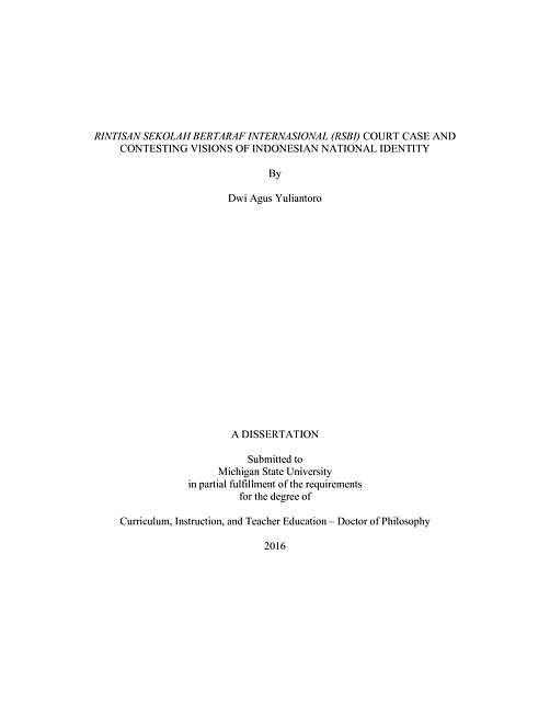 "Drawing on the concept of 'imagined community' as the basis for national identity (Anderson, 2006), this study examines a case of educational policy reform and resistance to it in which contested visions of national identity played a central role. The policy in question was adopted as part of Indonesia's National Education Law of 2003. It established a special category of schools known as Rintisan Sekolah Bertaraf Internasional (RSBI) (or Pilot International Standards School) in order to improve the quality of public education in Indonesia. For piloting, a selection of existing schools were transformed into International Standards Schools and were expected to enrich their curriculum under the influence of more highly developed countries. After 7 years of implementation, the constitutionality of these schools was challenged in the Constitutional Court. Six critical education issues constituted the core of the case: the constitutional requirement for the government to "smarten" the life of the nation, government responsibility for organizing and financing the education system, the charge that the government had created a dual education system whereas the Constitution required a unitary system, allegations of 'liberalization' (understood as creating a market system in education), the question of whether the new schools had led to discrimination and a 'caste' system, and finally the implications for national identity. Each side in the court case had the opportunity to present its vision of Indonesia in defense of its position. The RSBI trial is therefore a case in which we can look at how different elements of the nation bring different imaginations to bear on how they envision Indonesia as a nation, as a country. On one side, the petitioners envision Indonesia as a nation strongly united to maintain its rootedness in the country's cultural values and history, and not overly influenced by trends and conditions outside the country. On the other side, the government is seeing the nation from the "outside" looking in. Instead of focusing so much on the inner strengths that Indonesia already had, the government wanted to develop the knowledge and competencies (inspired by other nations) needed to enable Indonesia to play an important role internationally. In January 2013, after hearing these arguments, the Court reached a surprising decision in which it ruled against the government on all counts. The RSBI schools were promptly abolished and turned back into regular schools. In my view after studying the case, there was no need to rule so completely in favor of one side and against the other. Another way of imagining Indonesian national identity would be to see Indonesia as part of the global community, participating actively at the international level while still being rooted in its culture and values. Indonesians can identify with both of these imaginations without compromising their unity and national identity. In addition to this analysis of contesting visions of national identity, this study gives the English speaking reader a needed opportunity to understand how the Constitutional Court works. After being established in 2003, the court has played an important role in the transition to democracy. The RSBI court case is a landmark of democracy in education in Indonesia because for the first time in history Indonesian people used the court system to defeat the government."--Pages ii-iii.