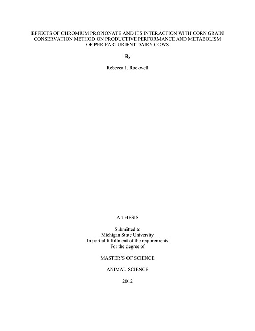 Our objective was to determine the effects of chromium propionate (CrPr) supplementation throughout the peripartum period on productive performance and metabolism of dairy cows and to determine the effects of ruminal starch fermentability on production responses to chromium propionate supplementation in the postpartum period. Forty–eight multiparous dairy cows were used in a randomized block design with a 2x2 factorial arrangement of treatments of control or 8 mg chromium (Cr) as CrPr and dry ground corn (DC) or high-moisture corn (HMC). Chromium treatment began 28±3 d before expected parturition and continued until 28±3 d postpartum (PP), and DC and HMC were fed in rations from parturition to 28±3 d PP. A common diet was fed from 28&plusnm;3 d PP to 84±3 d PP. There were no effects of treatment on dry matter intake (DMI) from parturition to 28±3 d PP, but an interaction among Cr, corn, and d PP was detected (P = 0.06) when cows were fed the common diet. A Cr, corn, and time interaction was also detected for 3.5% fat-corrected milk (FCM, P = 0.07) from parturition until 28&plusnm;3 d PP which continued after treatment ceased (P = 0.07).Although CrPr improved productive performance, no evidence of increased insulin sensitivity was observed. Postpartum plasma NEFA increased numerically and maximum NEFA was higher during the glucose challenge with CrPr supplementation. Supplementation of CrPr throughout the periparturient period interacted with starch source in PP diets and d PP to affect production responses after treatment application ceased.