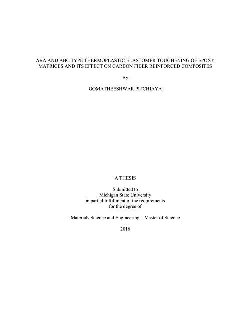 "Epoxy-matrices have high modulus, strength, excellent creep resistance, but lacks ductility. One approach to improve the mechanical toughness is the addition of thermoplastic elastomers (TPEs). The TPEs investigated here are triblock copolymers of styrene-butadiene-methyl methacrylate (SBM) and methylmethacrylate-butylacrylate-methylmethacrylate (MAM) of the ABC and ABA type, respectively. The effect of concentration (1-12.5 wt %) of these TPEs on a diglycidyl ether of bisphenol-A (DGEBA) epoxy cured with metaphenylenediamine (mPDA), has been investigated. The TPE-DGEBA epoxies were characterized by TGA, DMA, SEM and impact. The flexural modulus, flexural strength and thermal resistance remained unaffected up to 5 wt% loading of TPEs, and exhibited less than 10% decrease at higher weight percent. Tg was unaffected for all concentrations. Fracture toughness was improved 2503030% and up to 3703035% (when non- stoichiometric amount of curing agent was used) with TPE addition to epoxy/mPDA matrix. A SBM(1phr)EPON system was chosen to be the matrix of choice for a fiber reinforced composite system with a 4wt% aromatic epoxy sizing on a AS4 (UV-treated) carbon fiber. The 01D3C and 901D3C flexural modulus and strength of a SBM modified system was compared with the neat and their fracture surfaces were analyzed. A 89% increase in flexural strength was observed in a 901D3C flexural test for the modified system when compared with the neat. Novel sizing agents were also developed to enhance interfacial shear strength (IFSS) and the fiber-matrix adhesion and their birefringence pattern were analyzed."--Page ii.