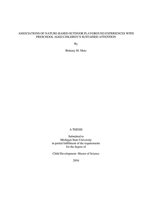 "The purpose of this study was to examine the association between preschool-aged children's exposure to a nature-based outdoor playground with a facilitation of nature-based activities and their sustained attention abilities. Using the Attention Restoration Theory as a theoretical framework, this study employed single group pretest-posttest design to measure children's sustained attention abilities before and after engaging in outdoor play on a nature-based playground with nature-based activities facilitated by teachers. The sample size was comprised of the 17 children, between the ages of 3 and 4 years, enrolled in the two preschool classrooms participating in the summer program at a child development laboratory in the Midwest, and two teachers. Descriptive statistics and paired t-tests were utilized to test the hypothesis that children perform with higher sustained attention after participating in nature-based activities. Results yielded no significant results when comparing pre and post sustained attention, operationalized as omission and commission errors in response to target stimuli in the Picture Deletion Test for Preschoolers task. However, overall errors decreased from pre to post examination. Unexpectedly, more participation in the nature-based activities was associated with greater sustained attention errors. Results of this pilot study suggest that structured and semi-structured nature-based activities may not yield the same benefits as unstructured experiences in nature. Implications for teachers training and curriculum planning are discussed."--Page ii.