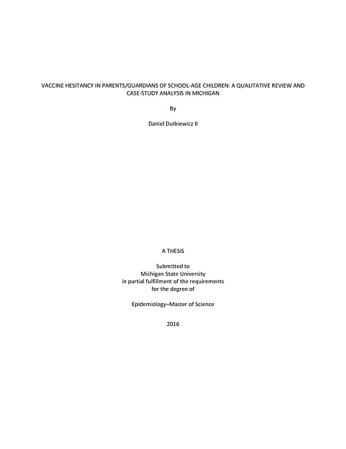 ABSTRACTVACCINE HESITANCY IN PARENTS/GUARDIANS OF SCHOOL-AGE CHILDREN: A QUALITATIVE REVIEW AND CASE-STUDY ANALYSIS IN MICHIGANByDaniel Dutkiewicz IIBackground: Non-medical vaccination exemption rates for kindergartners increased from 4.9% to 5.4% across the state of Michigan and increased from 7.3% to 11.6% in Grand Traverse County (MI) over the 3-year period covering the 2011/12, 2012/13, and 2013/14 school years.Objectives: This thesis seeks to interpret the results of the 2015 Michigan Department of Health and Human Services (MDHHS) administrative rule change modifying complexity of non-medical exemption filing procedures across Michigan and the 2015 special effort by local school and health officials to reduce the proportion of students with non-medical exemptions and incomplete vaccination records in Traverse City Area Public Schools (TCAPS).Study Design: This thesis utilizes a combination review/cross-sectional design to interpret the results of the MDHHS rule change and special effort by local officials in Traverse City.Results: 31.5% decrease in non-medical exemption rates across 73 counties, plus city of Detroit, and 66.27% reduction in total number of students with non-medical exemptions or incomplete vaccination records in TCAPS appear to 1. be consistent with previously observed inverse associations between complexity of non-medical exemption filing procedures and non-medical exemption rates and 2. further validate Peretti-Watel et al.’s theoretical approach to vaccine hesitancy.Conclusion: Increasing complexity of non-medical vaccination filing procedures at state level and requiring school-entry immunization requirement compliance at local level may motivate passively and actively hesitant parents/guardians to fully vaccinate their school-age child/children in Michigan.