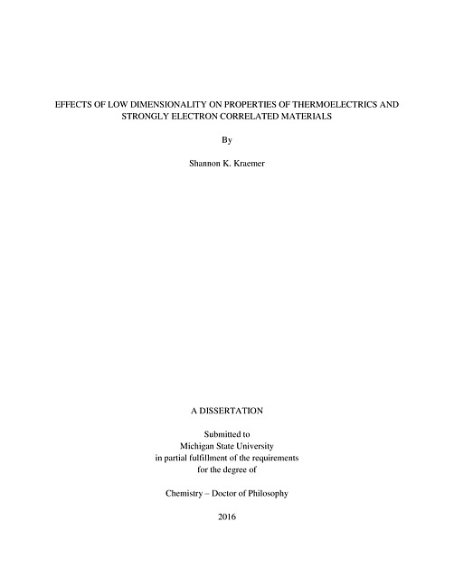 A study of the effects of low dimensionality, in both composites and single phase bulk materials, on thermoelectric properties was carried out. It is proposed that with the correct set of guidelines, bulk composite materials can achieve quantum confinement, inherently increasing the Seebeck coefficient, and lead to an overall increase the figure of merit. For this study, the binary system, Pb1-xNaxTe-Cd1-xNaxTe, was chosen based on those guidelines. Several synthetic approaches were employed to produce bulk quantities of nanostructures that mimic the key features of quantum well superlattices, potentially resulting in quantum confined system. This study led to an investigation of the effects of several different synthetic methods, which includes comparing aqueous based techniques such as SILAR versus inert atmosphere ampoule technique, on the thermoelectric properties of the materials. Sol-gel technique was utilized as a new facile method in synthesizing both PbTe and CdTe. The resulting materials were characterized using: thermogravimetric analysis-differential scanning calorimetry, powder X-ray diffraction, low and high temperature Seebeck and resistivity measurements, laser flash analysis, and Hall effect measurements.An additional study was carried out on the effects of low dimensionality in a lanthanum nickelate family T`-Lnn+1NinO2n+1 (n = 3 and ∞) known to demonstrate strongly correlated electron behavior. These metastable compounds are commonly formed by reducing a parent compound using low temperature techniques. The final metastable compound contains infinite layer NiO2 with Ni1+ in a square planar coordination. The T`-nickelates are of interest, due to the electronic and structural similarities to high temperature superconducting cuprates, where Cu2+ in a square planar coordination, CuO2, is a common structural element. The NiO2 similarity, both isostructural and isoelectronic, to CuO2 may display similar properties. The first parent compound, La4Ni3O10, was synthesized using traditional solid state techniques, sol-gel and ceramic methods, and was then reduced to La4Ni3O8 using hydrogen gas. The same compound was successfully synthesized with 0.20 Cu dopant, La4Ni2.8Cu0.2O8. The samples were characterized through powder X-ray diffraction, and specific heat. The second parent compound, LaNiO3, was synthesized by the same techniques, however, it was reduced to LaNiO2 using a novel solvothermal reduction technique. The same compound was successfully synthesized for the first time as a Cu doped series LaNi1-xCuxO2 where x = 0.05, 0.10, 0.15, 0.20, 0.25. The samples were characterized by powder x-ray diffraction for a structural analysis as well as for cell parameters determination.
