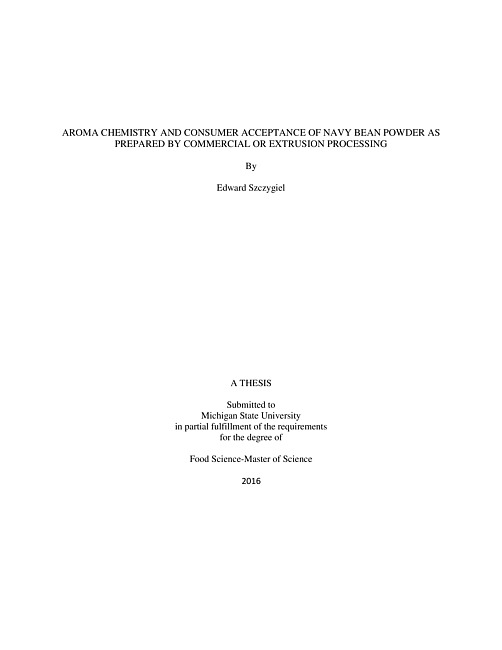 "Bean powder has been gaining in popularity among consumers due to its reported health benefits including reduced risk of heart disease, obesity and diabetes. Extruded Navy bean (Phaseolus vulgaris L.) powder can be considered as a cost-effective alternative to resource intensive traditional methods of processing. The objectives of the study presented in this manuscript were 1) to profile the volatile compounds derived from extruded and commercial Navy bean powders using headspace solid-phase microextraction (SPME) combined with gas chromatography-mass spectrometry; 2) to determine which of the volatile compounds are odor-active with gas chromatography-olfactometry; and 3) to investigate consumer acceptance of products formulated with extruded or commercial bean powder." -- Abstract.