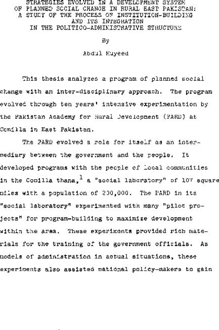 Strategies evolved in a development system of planned social change in rural East Pakistan : a study of the process of institution-building and its integration in the politico-administrative structure