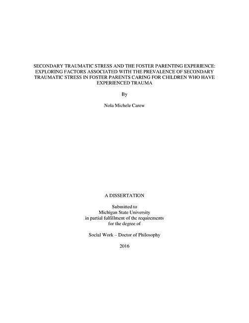 Secondary traumatic stress and the foster parenting experience : exploring factors associated with the prevalence of secondary traumatic stress in foster parents caring for children who have experienced trauma