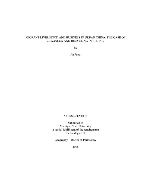 "Henancun, as one of the migrant enclaves in Beijing, emerged in the late 1980s with the development of the informal recycling business. Although rural-to-urban migrants and their recycling business play essential roles in providing the recycling service to the local residents and promoting the environmental protection, their existence is nearly invisible in the city. Focusing on the development history of Henancun, the structural and institutional barriers faced by both migrants and recycling businesses, and their coping strategies in Beijing, this dissertation research uses a combined qualitative and quantitative research method to examine the role of Henancun and the nature of the informal recycling business in recycling migrants' livelihood, and to understand the structural and institutional barriers faced by migrants and recycling as well as their coping strategies in Beijing. Based on questionnaires, interviews, observations and government documentation examinations, this study reveals that Henancun is both a migrant and a business enclave that emerged to cope with the socially and politically marginalized circumstances migrants have been facing in the city. Besides, the space of Henancun, with full-fledged services to accommodate migrants' livelihood and businesses, has gradually become a permanent 'outside' space that exists in between the city and migrants' hometowns. The informal nature of the recycling business also emerged as a strategy to cope with local regulations and uncoordinated governmental policies."--Page ii.