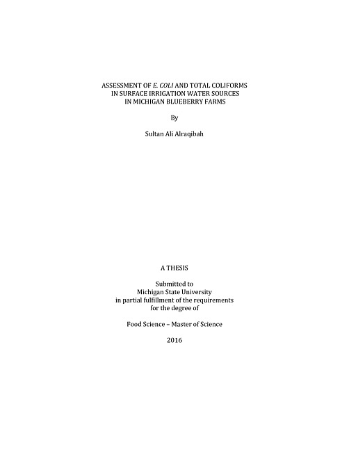 Fresh produce that is consumed raw can be a source of pathogens that cause human illness. This is particularly true for produce that is irrigated with untreated surface water at times close to harvest. Michigan has many blueberry farms, and these farms often irrigate their crops using untreated water drawn from irrigation ponds. This research was conducted to quantify E. coli levels in irrigation water sources at six blueberry farms in Michigan, and associate these levels with factors such as, rainfall, pH and conductivity of the water, and susceptibility of the water sources to runoff. Samples of water and blueberries were collected during summer 2015. Water samples were obtained twice weekly and blueberry samples once weekly. The Colilert Quanti-Tray/2000 method was used to quantify E. coli. Among the water samples (n=111), 95% contained detectable E. coli, and 17% of samples had E. coli levels greater than 126 MPN/100 ml, - the maximum geometric mean (GM) of E. coli level allowed in agricultural water under the FDA Produce Safety Regulation. The maximum detected level of E. coli was 4,611 MPN. Among the blueberry samples assayed (n=68), only 4.4% tested positive for E. coli, with the maximum level detected being 12 MPN E. coli per 100 grams of blueberries. These results indicate a high likelihood of detecting E. coli in surface irrigation water sources used on selected Michigan blueberry farms, and will be useful in establishing initial water quality profiles for these farms as required under the new FDA Produce Safety Regulation.