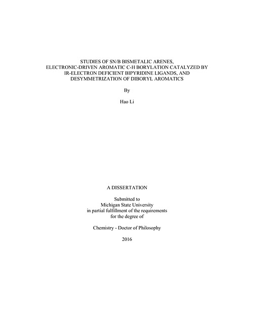 Studies of Sn/B bismetalic arenes, electronic-driven aromatic C-H borylation catalyzed by Ir-electron deficient bipyridine ligands, and desymmetrization of diboryl aromatics