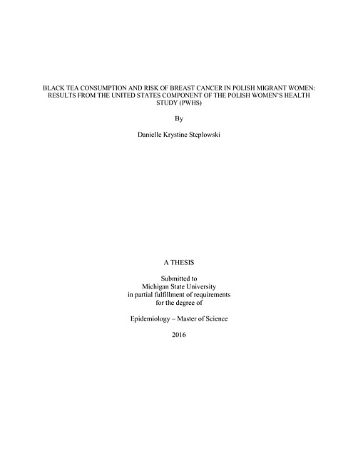 The aims of this study are to assess the association between black tea consumption and breast cancer risk, as well as between black tea consumption and the risk of developing premenopausal and postmenopausal breast cancer in a population of migrant Polish women residing in Cook County, IL, and in Detroit, MI. This thesis is a secondary analysis of data from the Polish Women’s Health Study (PWHS), a population-based, case-control study, of Polish-born women who immigrated to the United States. The analytic sample consists of 129 incident breast cancer cases and 303 population-based matched controls. Intake of black tea was assessed through an in-person food frequency questionnaire. Multivariable conditional logistic regression models were performed to estimate the association between black tea consumption and case status, and separate analyses were performed based on menopausal status. Relative to women consuming <1 cup of black tea/day, those reporting drinking 1-2 and 2-3 cups/day have an increased risk of developing breast cancer (OR = 1.84, 95% CI = 1.00-3.39 and OR = 2.33, 95% CI = 1.07-5.06, respectively). No association is observed for those consuming ≥3 cups/day. Analyses by menopausal status show similar patterns of association between black tea consumption and breast cancer risk for premenopausal women (OR = 2.81, 95% CI = 0.97-8.12 and OR = 3.47, 95% CI = 1.07-11.28 for 1-2 and for 2-3 cups/day consumers relative to <1 cup/day, and no association is observed for those consuming ≥3 cups/day). For postmenopausal women, the pattern is similar but does not reach statistical significance. This exploration into the PWHS dataset suggests that black tea consumption is positively associated with breast cancer risk, and specifically so for women who consume 1-3 cups/day.