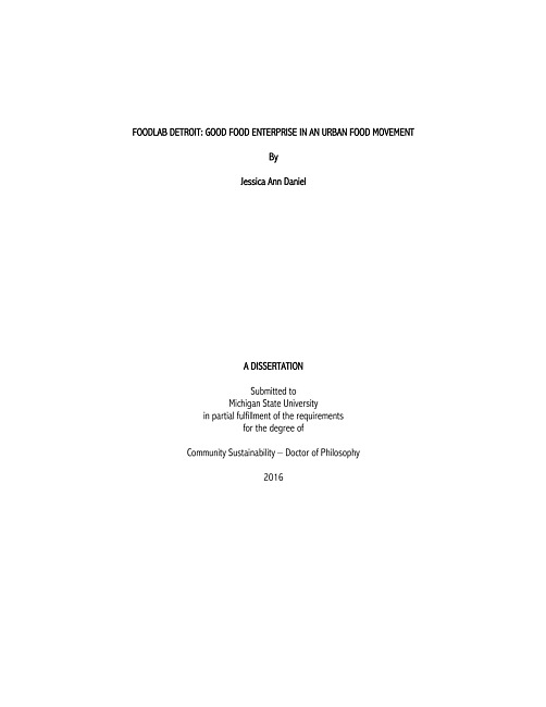 I define Good Food Enterprise (GFE) as a for-profit food firm that operates to some degree in solidarity with good food values (e.g. health, justice, accessibility, and sustainability), and that relies primarily or wholly on market-based revenue versus philanthropic or public funds for its continuation. Like other forms of alternative food initiatives (AFIs), GFE is growing in scale and sophistication across North America, yet there has been little research targeted at understanding or documenting the trend. Critics of other forms of AFIs note the limitations of entrepreneurial approaches to uphold good food values, showing how market-based approaches to food systems change may fail to address or even exacerbate challenges such as the exploitation of labor, structural racism, and environmental stewardship (Allen 1999; Allen et. al., 2003; Johnston 2008). Others, however, suggest that these criticisms can be reframed as an opportunity for organizers to shape entrepreneurship into a more powerful form of resistance (Donald 2008; Johnston 2008; Shattuck & Holt-Gimenez 2011; Starr 2010). FoodLab is a non-profit network of more than 150 entrepreneurs who are “committed to making the possibility of Good Food in Detroit a sustainable reality [...] as part of a Good Food movement that is accountable to all Detroiters" (FoodLab Detroit 2016). I founded and led the organization from 2011 to 2015 out of desire to serve my community and to ask: what are the opportunities, limitations, and tensions of Good Food Enterprise as a strategy in the food movement? This mixed-methods dissertation draws on a network survey, organizational records, interviews, and five years of participant observation as the basis for three journal articles, each addressing an aspect of this primary question. The research supports three major findings: first, FoodLab GFEs espouse a broad set of food movement values, though individual entrepreneurs vary in their understanding, prioritization, and integration of these values into their businesses, and public framing of values can differ from more internally-facing dialogue. Second, entrepreneurs are motivated by individual values and identity, but their embeddedness affects how they prioritize, manifest, and adopt new values. Finally, limitations noted by critics, including cultural and economic elitism, lack of emphasis on collective approaches to food systems change, and an overemphasis on the local – are real tensions that GFEs and organizers grappled with, but are not necessarily inherent to the GFE form. The study also uncovered tensions around organizational scale and impact.