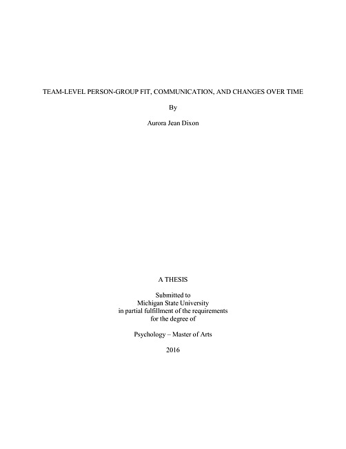"This thesis project explored the changes of person-group fit perceptions over a period of time in newly formed teams. These changes were explored as a function of communication in teams working on hidden profile tasks. It was expected that teams with higher person-group fit perceptions would perform better through person-group fit's hypothesized effects on communication. However, results showed that person-group fit did not impact performance as expected. More results and explanations of those results are discussed below."--Page ii.