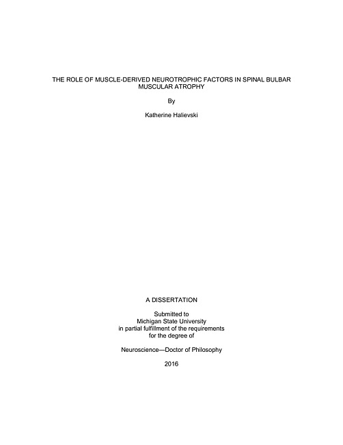 "Muscle-derived neurotrophic factors are critical to the survival and maintenance of a healthy neuromuscular system and their expression is often perturbed in neuromuscular disease, such as in spinal bulbar muscular atrophy (SBMA). SBMA is a disease that occurs only in men, is androgen-dependent, and is characterized by the progressive weakness and atrophy of muscles that are innervated by lower motoneurons of the brain stem and spinal cord. Moreover, a polyglutamine expansion mutation in the androgen receptor (AR) gene is linked to SBMA. CHAPTER 1 provides a general introduction on SBMA pathophysiology, and describes the various implicated roles of neurotrophic factors in health and disease, with a particular emphasis on the role of brain-derived neurotrophic factor in the neuromuscular system. In this dissertation, I examine the status and potential contribution of muscle-derived brain-derived neurotrophic factor in SBMA pathogenesis using two mouse models of this disease. I conclude that supplementing diseased muscle with exogenous BDNF may offer therapeutic benefit for treating symptoms of SBMA. In CHAPTER 2, I describe my discovery that skeletal muscle from diseased SBMA mice were deficient in BDNF. I found this deficit in two different mouse models of SBMA (one that overexpresses wild-type AR in a muscle-specific manner as well as one that globally expresses a polyglutamine-expanded AR). I also found comparable deficits in BDNF in both fast and slow muscles. To explore whether the deficit in muscle BDNF is relevant to SBMA pathology, I asked whether it was androgen-dependent like the disease. Indeed, BDNF mRNA levels were reduced in the presence of androgens, correlating with motor dysfunction, and when androgens were removed, both BDNF expression and motor function were restored to normal. Moreover, I found that BDNF levels were reduced prior to the loss of motor function, thus indicating that impaired BDNF expression in skeletal muscles is an early and possibly precipitating event in the emergence of motor dysfunction in SBMA. In CHAPTER 3, I sought to examine whether relieving the deficit in muscle BDNF would ameliorate disease symptoms, given the strong correlation found in CHAPTER 2, as well as the substantial evidence linking BDNF to the maintenance of proper neuromuscular function. To do so, I used a transgenic Cre/loxP approach to specifically overexpress BDNF in muscle cells of diseased SBMA mice. I found that overexpression of muscle BDNF slowed disease progression after its onset, slowing the normal rate of decline in hang performance. Moreover, this improvement was associated with an improvement in the expression of genes relevant to muscle contraction in slow-twitch muscle, but not fast. CHAPTER 4 provides an overview of my findings and describes remaining questions and future work to be done. The approach to delineate which disease mechanisms are improved by muscle BDNF to slow disease progression will be discussed in CHAPTER 4. Candidate mechanisms include improved neuromuscular transmission and muscle contractile force tension in slow-twitch muscles."--Pages ii-iii.