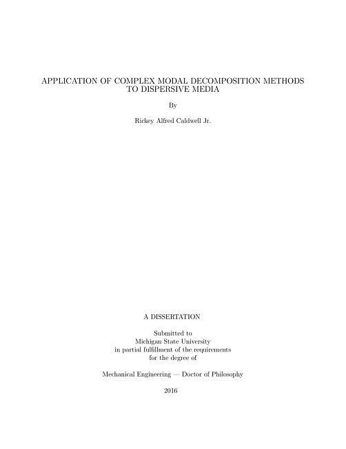"Complex orthogonal decomposition (COD) is applied to an experimental beam to extract the dispersive wave properties using response measurements. The beam is made of steel and is rectangular with a constant cross section. One end of the beam is free and is hung by a soft elastic cord. An impulse is applied to the free end. The other end is buried in sand to absorb the wave as it travels from the impact site on the free-end; this effectively prevents reflections of the wave off the buried end and emulates a semi-infinite beam. COD is applied to the complex analytic displacement ensemble to obtain complex modal vectors and associated complex modal coordinates. The spatial whirl rates of nearly harmonic modal vectors are used to extract the modal wave numbers, and the temporal whirl rates of the modal coordinates are used to estimate the modal frequencies. The relationship between the frequencies and wave numbers are used to describe the dispersion relationships, which are compared favorably to those of the theoretical infinite Euler-Bernoulli beam. Further efforts are applied, and a new methodology is developed. A novel method called smooth complex orthogonal decomposition (SCOD) is applied to a simulated semi-infinite beam and the above instrumented experimental beam. These measurements are converted into complex analytic displacements and velocities ensembles, which are used to compute two correlation matrices. These correlation matrices form a complex generalized eigenvalue problem whose eigenvalues and eigenvectors lead to the extractions of the frequencies and wavenumbers of the constituent waves of the traveling pulse. SCOD directly extracts the frequencies of the traveling waves from the eigenvalues. SCOD can extract the geometric relationship, phase velocity, and group velocity and agrees with analytical predictions. Applications of both methods are applied to a simulated infinite mass chain. The dispersion relationship of a discrete chain of masses is extracted from numerically simulated data by applying complex modal decomposition. When an impulse excitation is applied to one end of a semi-infinite mass-spring chain, a wave is generated and propagates down the chain. This wave consists of various modes. The time record for the generated data is limited such that the wave reflection does not return to the sensed masses. For example, a 250-mass chain is simulated, and we consider (or sense) the time record of the first 100 masses. The data collected from the numerical simulation consists of the displacements of each mass at each time step. This data is then used to extract complex modes using COD and SCOD. The extracted complex modes accommodate modal traveling waves. We then compute the frequencies and wave numbers from modal coordinates and mode shapes, respectively. The amplitudes and frequencies of the modes are also estimated using Rayleigh quotients. The COD extracted dispersion relationship matches the analytical prediction of the dispersion curve for the linear mass chain."--Pages ii-iii.