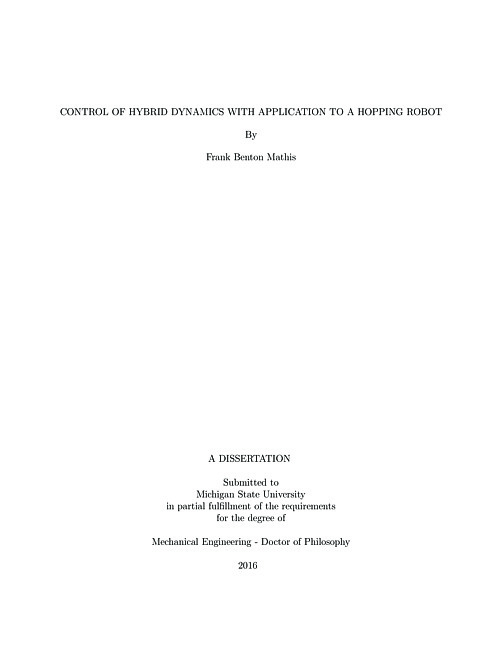 "Control of dynamic motion is an important subject of study in robotics as it is desirable for robots to have a specific motion pattern rather then moving to a set point. The motions of robots also involve changing dynamic behaviors due to interaction with the environment, such as during contact, and this leads to hybrid system dynamics. A popular example of a hybrid dynamical system is a legged robot; the hybrid dynamics is due to the periodic switching of swing and stance legs and impulsive dynamics due to ground contacts. Legged robots require control of a dynamic trajectory defined by the walking gait or running motion. For legged robots, the spring loaded inverted pendulum (SLIP) model is commonly used to describe the dynamic motion in a simplified manner. The SLIP model has also been used for control of hopping robots and a fundamental limitation of the model is that it fails to account for impact with the ground; this is due to its single degree-of-freedom in the vertical direction. We investigate the control of a hopping robot starting from a more general two-mass model and then expand the theory to planar multi-link robot systems. The investigation involves two ground contact models, rigid and elastic, for the objective of apex height control. In the rigid case, the ground is assumed to provide an impulsive force to the hopping robot resulting in an inelastic collision. A hybrid control strategy is designed to deal with the hybrid dynamical system: a continuous controller based on partial feedback linearization is used in conjunction with a discrete controller that updates a control parameter at each hop to achieve the control objective. In the elastic case, the ground acts as a massless spring, which deflects as the robot exerts a force upon contact. In this case, we show that a continuous controller based on the backstepping algorithm can ensure asymptotic convergence to the desired apex height. Several robot configurations are considered, and for each configuration the complete hybrid dynamics is taken into account while designing the controller. The controllers compensate for the impulsive dynamics as well as higher order dynamics that are ignored in simplified models such as the SLIP model. Experimental validation of apex height control of a two-mass hopping robot on a rigid foundation is provided"--Pages ii-iii.