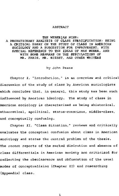 The Weberian Mine : a probationary analysis of class stratification ; being a critical essay on the study of class in American sociology and a suggestion for improvement, with special reference to the ideas of Max Weber, and with some remarks on the sp...