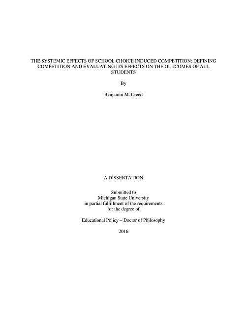 Using the three paper format, this dissertation contributes to the literature evaluating school choice and school competition. This study highlights important gaps in our collective understanding of the impact of school choice policy. This dissertation contributes in multiple ways to the closing of important gaps related to the effect of school choice induced competition on student outcomes: 1) developing a consistent measure of competition grounded in theory and empirical evidence and 2) evaluating the systemic effects of competition, the effects of school competition on all students within an educational market regardless of the school attended. I address the first gap in three ways. I highlight the existing variation in competition measures and demonstrate that the presence of multiple competition measures in the extant literature is cause for concern. I do this by showing that you can infer positive, negative, and null impacts of competition on student outcomes simply by substituting the various measures of competition, operationalized for the Michigan context, into the same Fixed Effects regression model. Second, I lay out a process for selecting between measures of competition, with the goal of a continued conversation around improving our measures of competition. Third, I suggest a theoretically grounded, empirically refined measure of competition. These efforts contribute to the current school choice policy conversation by focusing attention and thought on the definition and measurement of competition, a key avenue through which choice is to improve the educational system. Improving on the measurement of competition should appeal to all interested in school choice as it is essential to any evaluation of the policy. Given the current debates and mixed results, the common ground of developing an accepted measure of competition would help develop a consistent literature base. I address the second gap in two ways. I first highlight the importance of bringing all students in an educational market under one framework – that of systemic effects – in addition to comparing the performance in a student’s residentially assigned district to charter schools or other public schools through inter-district choice. While evaluating the systemic effects of school choice induced competition allows us to address questions of policy relevance, such as what are the average impacts of competition on educational outcomes for all students residing within an educational market, there are no domestic studies of the systemic effects of competition. I then produce the first such domestic study for the state of Michigan. I create a unique five year panel dataset covering the school years 2008-09 through 2012-13 – drawing on the Michigan’s Center for Educational Performance and Information and the Common Core of Data – to evaluate the systemic effects of competition on the average and variation of student test score outcomes. The evidence suggests that there is not a single systemic effect of competition for all districts or contexts. The average impact and the impact on the variation of test scores differs across district context. Competition is associated with negative impacts in some cases and positive impacts in others. In other words, competition may not be a tide that lifts all boats nor does it lead to a narrowing of the gaps between the boats.In sum, this paper makes multiple contributions to the school competition literature. I underscore the need for more careful attention to be paid to the measurement of competition. I also demonstrate the value-added by evaluating the impact of competition on the entire system rather than just on its component parts. In this work I demonstrate that competition does not operate in a simple manner – introducing options yields competitive pressure yields positive improvements. There is evidence that competitive pressure has mixed impacts dependent on context. This has implications for both the design of policy as well as whether or not school choice will yield improvements for all students.