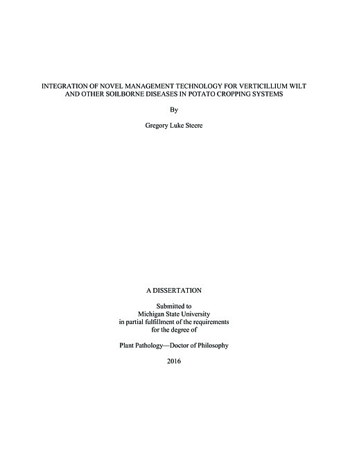 "Potato production systems have been long plagued by soilborne diseases which can compromise tuber quality and yield. Verticillium wilt caused, by Verticillium dahliae Kleb., is a widespread disease of potatoes (Solanum tuberosum L.) and is an annual problem for potato growers throughout the USA. When not-treated, severely infested fields can lose marketable yield from 30-50%. The cost of pre-plant fumigation, new restrictions imposed by government agencies on the application of soil fumigants, and demand for high quality tubers has led to a renewed focus on management of Verticillium wilt in potato production in Michigan and across the USA. Experimental field trials were conducted to determine efficacy of several commercially available fungicides applied in-furrow at-planting to decrease V. dahliae propagules in the rhizosphere and wilt disease in plant stems. Additional trials were conducted based on preliminary results to determine the effects of fluopyram at three application times; at-planting, at-emergence, and at-tuber initiation, for management of Verticillium wilt. At-emergence application of fluopyram or any combination of application times coupled with an at-emergence application led to a reduction in V. dahliae propagules in stem sap and subsequent yield increase, but had no effect on V. dahliae propagule levels in the rhizosphere. Finally, the effects of seven different at-planting and/or foliar treatment programs for control of Verticillium wilt were evaluated with special attention to root-lesion nematode (RLN) levels in the soil. Significantly lower levels of Verticillium wilt symptoms at the end of the growing season were seen in treatments when compared to the non-treated control, however, no significant difference was observed in tuber yield, V. dahliae propagule levels in the soil, or RLN populations in the soil. In addition to the work on Verticillium wilt, an approach integrating traditional soil sampling and GIS mapping systems was developed to analyze edaphic qualities and quantify soil microbial diversity across entire fields in order to examine correlations between yield and soil biological factors on a spatial scale. The automated geostatistical interpolation of soil properties has greatly reduced the cost and time of the statistical methods utilized in predictive statistics. The incorporation of inoculum levels along with the use of geostatistical analysis led to a methodology of sub-field management strategies based on conditional probability and binary mapping to predict where Verticillium wilt may occur based on pathogen populations and disease thresholds. Sub-field management strategies allow for more accurate management of problem areas in fields with fewer inputs. The methods presented are a novel approach to analyzing and predicting potato crop health, soil abiotic factors, and soilborne pathogens throughout an entire field with low error. Incorporation of these methods into potato integrated disease management may reduce management costs while simultaneously reducing the environmental impact of management inputs and increasing profitability."--Pages ii-iii.