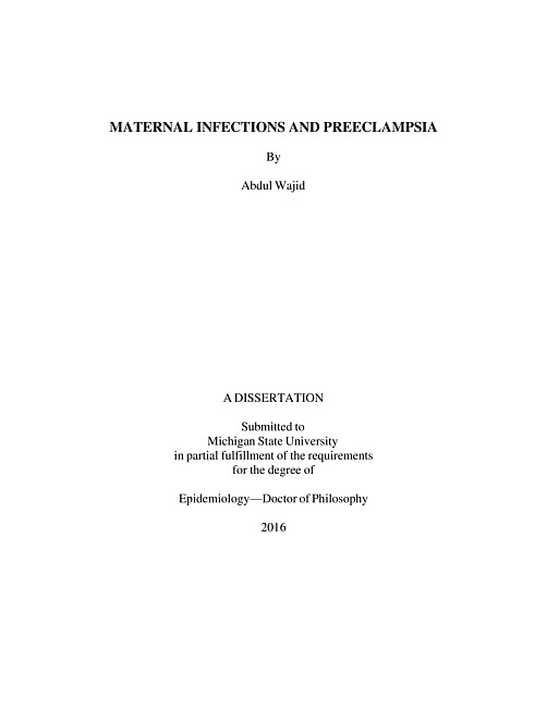 Introduction: Preeclampsia (PE) is a pregnancy related health condition which affects maternal and newborn health significantly. No causative factor has been identified yet. Evidence suggests the role of Helicobacter pylori, cytomegalovirus and Chlamydophila pneumoniae in the development of PE. I conducted this research to explore the role of these microorganisms in the development of PE.Methods:I conducted a nested case-control study by using the ARCH dataset and matched cases with controls on: maternal age (±3 years), maternal race, parity and gestational age at blood withdrawal. My outcome variable was PE status and variable of PE was not present in the ARCH questionnaire; however, birth certificate provided this information. To find more cases, because we decided to review medical records (MR) of the ARCH study subjects. Case base for my study was obtained by reviewing medical records. I used conditional logistic regression to look for the association between IgGs of three microorganisms and other covariates of interest, and PE status by building three separate conditional logistic regression models.Results: Out of total sample of 73 subjects, 21 were cases. Two (9.5%) of the cases and three (5.8%) of the controls were found positive for anti H. pylori IgGs in their plasma. For CMV, 7 (33.3%) cases and 15 (28.9%) controls had anti CMV IgG in their plasma while thirteen (62%) cases and 25 (48%) of controls were positive for anti C. pneumoniae IgGs in their plasma. At the Univariable analysis, Smoking during pregnancy showed a protective effect for PE. The women who smoked during pregnancy were 40% less likely to have PE than women who did not smoke during pregnancy. Women whose pre-pregnancy BMI (PPBMI) was more than 30 were 8 times more likely to develop PE as compared to the women whose PPBMI was less than 25. Multivariable conditional analysis found that women who were positive for anti H. pylori IgGs in their plasma were 2.4 times more likely to develop PE (mOR: 2.4; 95% CI: 0.2-32.2) than those women whose plasma was negative for these antibodies after controlling for the effect of other variables in the model. Similarly, women with anti CMV IgGs in their plasma were 1.4 times more likely to have PE than women without any evidence of CMV infection (mOR: 1.4; 95% CI: 0.3-5.6) after controlling for the effect of other variables in the model. For C. pneumoniae, the odds of anti C. pneumoniae IgGs among PE cases is 2.3 times (mOR: 2.3; 95% CI: 0.6-9.1) the odds of anti C. pneumoniae IgGs after controlling for the effect of other variables in the model.Conclusions: Past infection, as depicted by anti H. pylori IgG, anti CMV IgG, and anti C. pneumoniae IgG, did not show any association with the development of PE in Lansing, Michigan. No evidence of recent or current infection with CMV as measured by IgM, identified as a risk factor for the development of PE in Lansing, Michigan. To explore this relationship further, similar studies should be carried out in future with a larger sample size especially in populations where prevalence of these infections is high. Future studies should include serology for anti-CagA antibodies for the exploration of the role of H. pylori. Exploration of the infectious agents DNA from placental tissue may support the immunological cause of PE.