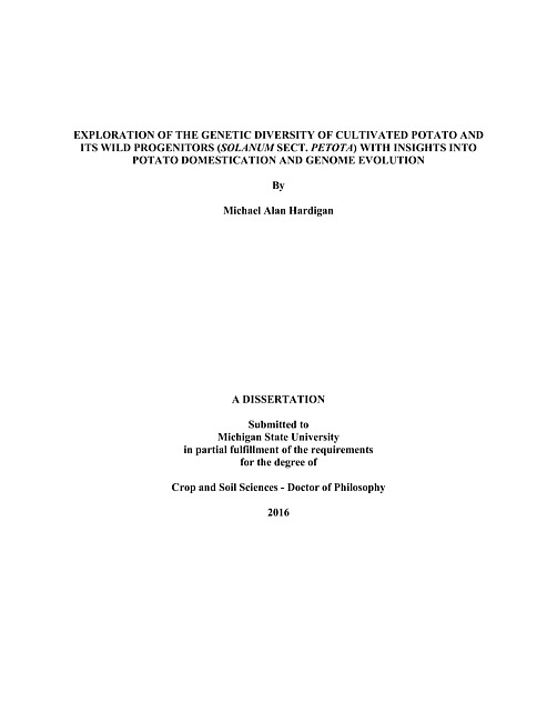 "Cultivated potato (Solanum tuberosum L.) is a clonally propagated autotetraploid (2n=4x=48) with high potential for genetic improvement due to the expansive genetic diversity of its related germplasm. This diversity includes high levels of heterozygosity but also deleterious genetic load in cultivated clones, multiple groups of genetically distinct landrace sub-species, and over 100 related tuber-bearing species that can introduce heterosis and adaptation. To generate a better understanding of the landscape of potato genetic diversity, studies were conducted to (1) explore the genetic relationships between tuber-bearing Solanum species, landraces, and cultivars, (2) investigate the role of structural variation in cultivated potato genome evolution and diversity, and (3) identify key loci that were selected during domestication of potato. Phylogenetic analysis of tuber-bearing Solanum species was examined in the first application of genome-wide nuclear single nucleotide polymorphism (SNP) markers with a diversity panel of potato species from the USDA Potato Gene Bank core collection. Genotyping a panel of 75 accessions representing 25 species and 213 cultivated tetraploid clones using 5,023 polymorphic SNPs supported previous taxonomic placement of wild potato germplasm, while reinforcing the theory of a Peruvian domestication origin for potato. Several genes involved in carbohydrate metabolism or with potential roles in tuber development were found to contain diverging allele frequencies in the wild and cultivated potato groups suggesting they may have been key loci involved in domestication. A comprehensive analysis of genomic variation (sequence and structural variation) using 30- 70x sequence coverage in a panel of 12 monoploid/doubled monoploid potatoes derived from primitive South American diploid landraces was performed. Extensive copy number variation (CNV) was found to impact over 30% of the potato genome and nearly 30% of genes, with widespread deletion affecting lowly expressed sequences, and enriched duplication within gene families that function in adaptation and environmental response. This study revealed CNV is equally relevant to sequence-level variation (SNPs, insertions/deletions) in its contribution to deleterious mutation load and gene evolution in the potato genome. The study also demonstrated that the extensive structural heterogeneity present in tetraploid genotypes is present in their diploid progenitors, and thus, is not the result of polyploidy alone. A diversity panel was sequenced at 8x to 16x coverage to enable genome-wide comparison of allele composition in 23 tetraploid potato cultivars, 20 wild species and 20 landrace progenitors. Analysis of selection signatures including FST, Tajima's D, reduced nucleotide diversity and allele frequency differences yielded a set of domestication candidate genes including several regulating carbohydrate pathways, glycoalkaloid biosynthesis and stress responses. Comparable levels of total sequence diversity were present in elite cultivars and South American landraces, yet significant genetic variance between landrace populations was repartitioned as single-clone heterozygosity in cultivars, confirming the hypothesis that elite varieties represent a highly heterozygous group lacking significant population structure. These findings may assist the ability of potato breeders to exploit key performance-related loci and heterosis in the future."--Pages ii-iii.
