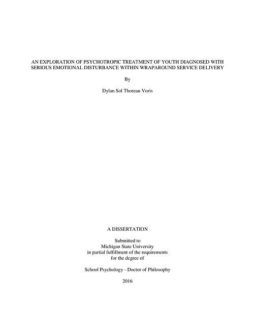 "Psychotropic medications are often a component of the care that vulnerable youth, such as those diagnosed with serious emotional disturbance (SED), receive when involved in wraparound services provided by state agencies (Harper et al., 2014). There is evidence that vulnerable youth receive (a) high rates of psychotropic medications with potentially serious side-effects, such as antipsychotics and antidepressants, and (b) high rates of polypharmacy and multi-class prescriptions leading some to question the overmedication and cost-benefit considerations associated with this practice within these populations (McMillen, Fedoravicius, Rowe, Zima, & Ware, 2007). Yet, no published studies to date have examined psychotropic medication practices within wraparound services. Using data from an ongoing statewide wraparound evaluation project, the current study examined the psychopharmacological treatment of a racially diverse group of youth diagnosed with SED (N=422) ages 7-18 receiving wraparound services. Results indicate a greater percentage of youth receiving wraparound were prescribed psychotropic medications (56% vs. 35-40%) and had higher rates of multi-class treatments (61% vs. 22-45%) than is reported in the literature for similar groups (Sullivan & Sadeh, 2015; Zito et al., 2008). Use of generalized linear mixed models indicated that there were no statistically significant reductions in the overall number of psychotropic medications taken by youth in wraparound, rates of prescription practices (i.e., monotherapy, polypharmacy, multi-class treatments) or individual class treatments. Gender, age, foster status and the nature of the community-based setting (urban or rural) did not influence changes in the overall number of medications, rates of prescription practices, or medications within class. Youth who had reductions in the number of psychotropic medications and those who initiated medication treatment during wraparound had similar and clinically significant improvements in mental health functioning compared to other youth in wraparound. Future research on psychotropic medication practices within wraparound services is necessary."--Pages ii-iii.