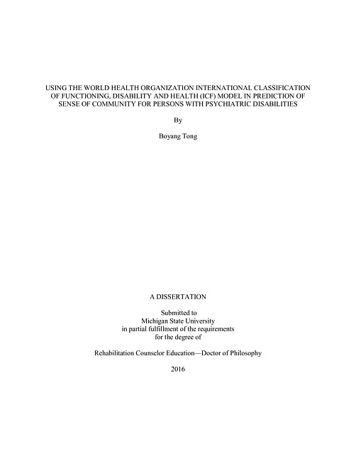 ABSTRACT USING THE WORLD HEALTH ORGANIZATION INTERNATIONAL CLASSIFICATION OF FUNCTIONING, DISABILITY AND HEALTH (ICF) MODEL IN PREDICTION OF SENSE OF COMMUNITY FOR PERSONS WITH PSYCHIATRIC DISABILITIESByBoyang TongPromoting sense of community (SOC) is beneficial in facilitating persons with psychiatric disabilities to achieve community integration and recovery. However, SOC is still largely understudied in the field of rehabilitation counseling. It is shown that SOC is a multidimensional construct involving interactive process, which is the product of the person, the environment, and the interactions among them. Therefore, a holistic and interactive model is necessary in order to understand the biopsychosocial predictors of SOC from a comprehensive perspective. This study used the World Health Organization’s International Classification Functioning Disability and Health (ICF) model as a conceptual framework to examine the complex relationships among health conditions and functioning, activity, personal and environmental factors, in affecting SOC outcomes. By applying the ICF model, the purpose of this study was to evaluate the proposed model of SOC for persons with psychiatric disabilities. Hierarchical regression analysis was used to understand the overall model of SOC, as well as the unique contribution of each ICF construct and its interaction effects among the ICF constructs. Results of the study suggest that demographic variables (i.e., diagnosis, treatment related support, and SSA beneficiary status), functioning variables (i.e., symptom severity and cognitive functioning), activity variable (i.e., social functioning), personal variables (i.e., resilience and self-efficacy), and environmental variables (stigma and social support) account for over 57% of the variance in SOC in this study. This study provides a comprehensive understanding of SOC and contributes new information by presenting the theoretical guidance and research evidence of proposing and evaluating the effectiveness of the ICF-based model of SOC for psychiatric populations. Future research direction is guided to expand the current model of SOC by exploring more influential disability-related as well as psychosocial factors of SOC. This study also inform rehabilitation professionals on how to provide effective and efficient rehabilitation services for promoting the community experiences of persons with psychiatric disabilities, such as treatment adherence, anxiety management, self-efficacy promotion, stigma reduction, and social support provision.