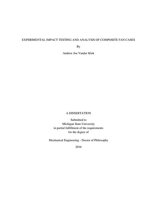 For aircraft engine certification, one of the requirements is to demonstrate the ability of the engine to withstand a fan blade-out (FBO) event. A FBO event may be caused by fatigue failure of the fan blade itself or by impact damage of foreign objects such as bird strike. An un-contained blade can damage flight critical engine components or even the fuselage. The design of a containment structure is related to numerous parameters such as the blade tip speed; blade material, size and shape; hub/tip diameter; fan case material, configuration, rigidity, etc. To investigate all parameters by spin experiments with a full size rotor assembly can be prohibitively expensive. Gas gun experiments can generate useful data for the design of engine containment cases at much lower costs. To replicate the damage modes similar to that on a fan case in FBO testing, the gas gun experiment has to be carefully designed. To investigate the experimental procedure and data acquisition techniques for FBO test, a low cost, small spin rig was first constructed. FBO tests were carried out with the small rig. The observed blade-to-fan case interactions were similar to those reported using larger spin rigs. The small rig has the potential in a variety of applications from investigating FBO events, verifying concept designs of rotors, to developing spin testing techniques. This rig was used in the developments of the notched blade releasing mechanism, a wire trigger method for synchronized data acquisition, high speed video imaging and etc. A relationship between the notch depth and the release speed was developed and verified. Next, an original custom designed spin testing facility was constructed. Driven by a 40HP, 40,000rpm air turbine, the spin rig is housed in a vacuum chamber of Φ72inx40in (1829mm×1016mm). The heavily armored chamber is furnished with 9 viewports. This facility enables unprecedented investigations of FBO events.In parallel, a 15.4ft (4.7m) long Φ4.1inch (105mm) diameter single stage gas gun was developed. A thermodynamic based relationship between the required gas pressure and targeted velocity was proposed. The predicted velocity was within ±7%. Quantitative measurements of force and displacement were attempted. The transmitted impact force was measured with load cells. The out-of-plane deformation was measured with a projection grating profilometry method. The composite panels and fan cases used in this work were made of S2-glass plain weave fabrics with API SC-15 toughened epoxy resin using the vacuum assisted resin transfer molding (VARTM) method. Using the gas gun, the impact behavior of the composite was investigated at velocities ranging from 984ft/s to 1502ft/s (300m/s to 458m/s) following a draft ASTM testing standard. To compare the ballistic protection capability of different materials, a new parameter EBL, the projectile kinetic energy at the target ballistic limit normalized by the contact area of the projectile, was proposed. S2-glass/epoxy composite is ranked very high in EBL per areal weight. Finally, a testing method for replicating spin pit testing with a gas gun test was developed. Major differences between the two tests are the initial conditions of the blade upon contact with the target. In spin testing, the released blade has two velocity components, rotational and translational whereas in gas gun testing, the projectile has only the translational velocity. To account for the influence of the rotational velocity, three projectile designs were experimentally investigated. The results show that to generate similar damage modes in gas gun testing, it is critical to ensure the deformation of the projectile before testing is similar to that of a released blade. With the pre-bent blade, the gas gun experiment was able to replicate the damage modes of the fan case in FBO test on flat composite panels.