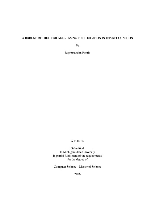 "The rich texture of the iris is being used as a biometric cue in several human recognition systems. Iris recognition systems are fairly robust to small changes in illumination and pose. However there are a number of factors that still adversely affect the performance of an iris matcher. These include occlusion, large deviation in gaze, low image resolution, long acquisition distance and pupil dilation. Large differences in pupil size increases the dissimilarity between iris images of the same eye. In this work, the degradation of match scores due to pupil dilation is systematically studied using Hamming Distance histograms. A novel rule-based fusion technique based on the aforementioned study is proposed to alleviate the effect of pupil dilation. The proposed method computes a new distance score at every pixel location based on the similarities between IrisCode bits that were generated using Gabor Filters at different resolutions. Experiments show that the proposed method increases the genuine accept rate from 76% to 90% at 0.0001% false accept rate when comparing images with large differences in pupil sizes in the WVU-PLR dataset. The proposed method is also shown to improve the performance of iris recognition on other non-ideal iris datasets. In summary, the use of multi-resolution Gabor Filters in conjunction with a rule-based integration of decisions at the pixel (bit) level is observed to improve the resilience of iris recognition to differences in pupil size."--Page ii.