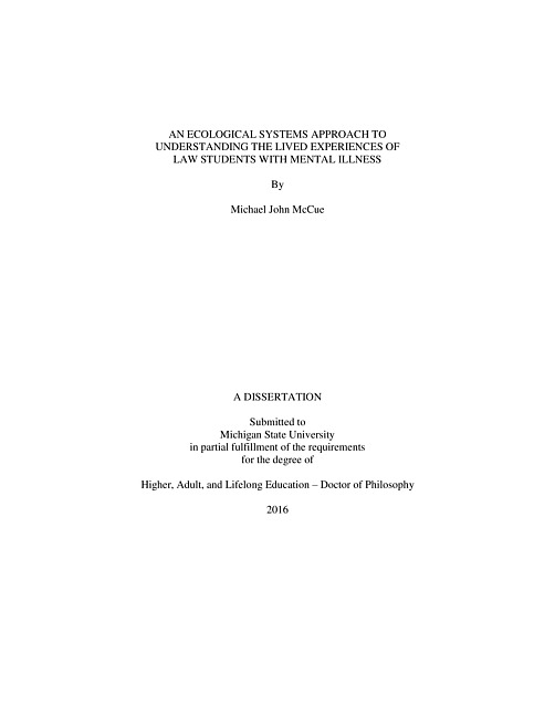 "Students who matriculate law school bring with them their mental illness which influences their law school experience. Although research in this area exists, it is limited and dated. This study is the first nationwide, multi-institutional, qualitative study that investigates the lived experiences of law students with mental illness. The study reveals that students with mental illness face unique challenges in law school beyond the traditional challenges encountered by law students. This study's research question was: What are the lived experiences of law students with mental illness? Understanding these individuals' lived experiences offers a glimpse into how they interacted in their various environments and how these interactions influenced them. Using a hermeneutic phenomenological approach this study gathered data from eleven law students from across the United States. Participants engaged in three interviews which focused on their lived experiences. These data were then analyzed using the Bronfenbrenner's ecological systems theory. This study reveals the ways law students with mental illness navigate their law school experience. Law students with mental illness encountered stigma, microaggressions, and other obstacles in their journey to becoming a lawyer. Because of the competitive nature of law school, students with mental illness feared speaking publicly about their mental illness. The stigma further distressed students based on mental health questions asked as part of the character and fitness application for entry into the bar. Students reported that the microsystems of family, romantic partners, friends, other law students with mental illness, and faculty influenced their development. In the exosystem, the results yield the influences of isolation, lack of institutional understanding of mental illness, the law school milieu, legal pedagogy, the legal profession, and the character and fitness portion of bar admission. This study reveals the high level of resilience that law students with mental illness possess and their ambition exhibited by the participants helped them succeed in law school. Participants offered suggestions to prospective law students, law schools, and the legal field. In addition, creating programs to reduce stigma and increase education about mental illness reflected the opinions of most of the students. Students also urged law schools to make available more services for students and to actively inform students of those opportunities. Through the course of this research several thought questions arose that are not yet ripe for further research. These questions address the future of legal education and the legal profession. This applies to not only persons with mental illness, but also the generational and global changes in the legal profession."--Pages ii-iii.