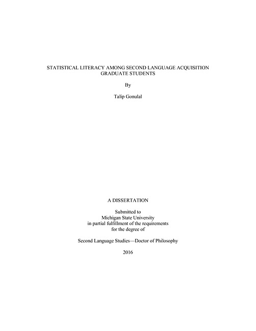 The use of statistics in second language acquisition (SLA) research has increased over the past 30-40 years (Brown, 2004; Loewen & Gass, 2009). Further, several methodological syntheses (e.g., Plonsky, 2011; Plonsky & Gonulal, 2015; Winke, 2014) revealed that researchers in the field have begun to use more sophisticated and novel statistical methods (e.g., factor analysis, mixed models/mixed regression analyses, structural equation modeling, Bayesian statistics) even if common inferential statistics (e.g., t tests, ANOVAs, and correlations) are still dominating quantitative second language research (Plonsky, 2013, 2015). However, the increased use of a larger variety of statistical methods does not necessarily translate to high methodological quality. In fact, several SLA researchers have accentuated the state of statistical literacy and statistical training in the field of SLA (e.g., Godfroid & Spino, 2015; Loewen et al., 2014; Norris, Ross & Schoonen, 2015; Plonsky, 2011, 2013, 2015, Plonsky & Gonulal, 2015). Indeed, statistical literacy appears to be critical to SLA researchers’ ability to advance L2 theory and practice. While some studies on statistical literacy in the field have been published, it appears that no studies exist that measure SLA researchers’ statistical knowledge, which is also an important piece of the puzzle. In this dissertation, I focus on SLA doctoral students—an important part of academia— and attempt to investigate their statistical training and knowledge of statistics. To this end, I used two primary instruments: the SLA for SLA (that is, the Statistical Literacy Assessment for Second Language Acquisition) survey, and semi-structured interviews). One hundred and twenty SLA doctoral students in North America took the SLA for SLA survey, and 16 of them participated in follow-up interviews. The participants were from 30 different SLA programs across North America. The results of this study show that doctoral students are well trained in basic descriptive statistics, while their training in inferential statistics, particularly advanced statistics, is limited. Further, it appears that self-training in statistics is not very common among SLA doctoral students. The results also point out that more in-house statistics courses, particularly intermediate and advanced statistics, are needed. When looking at their statistical knowledge, the results indicate that SLA doctoral students are good at understanding descriptive and inferential statistics, but they find it hard to interpret statistical analyses related to inferential statistics that are commonly encountered in SLA research. Another important finding is that as might be expected, the number of statistics courses taken, self-training in statistics and quantitative research orientation are predictive of statistical literacy, whereas surprisingly years spent in the doctoral program are significant components of statistical literacy. Based on the findings of this study, I make some suggestions directed toward improving statistical literacy in the field of SLA.