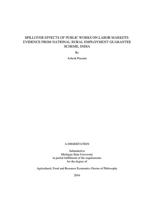 Public works guaranteeing work at pre-determined wages are intended to provide security to the seasonally unemployed. These programs, also referred to as “cash-for-work” or workfare, are an increasingly used feature of labor market policy for developing countries. Long durations of guaranteed employment at close to, or above the prevailing market wage are likely to put upward pressure on the local market wage rate through two channels - higher competition for casual labor and increased enforcement of minimum wages (Berg et al. 2012, Subbarao 2003). When implemented non-uniformly across proximate and interlinked labor markets, these programs are also likely to generate spillovers from assigned to unassigned areas. Accounting for these spillovers is necessary and indeed, critical for a comprehensive cost-benefit analysis of large-scale public works programs, increasingly being viewed as anti-poverty schemes. Impact evaluations of the world’s largest public works program, India’s National Rural Employment Guarantee Scheme (NREGS), have estimated a variety of labor market effects (Azam 2012, Berg et al. 2012, Imbert and Papp 2015), but this literature is agnostic about general equilibrium spillovers generated by the program, potentially biasing these estimates downwards. This dissertation first tests for the presence of general equilibrium spillovers generated by NREGS in neighboring but unassigned labor markets, exploiting the plausibly exogenous spatial and temporal variation in exposure induced by the program’s staggered rollout. Next, it presents evidence for the theory that changes in short-distance, seasonal migration to contiguous program areas is the mechanism generating cross-district spillovers in exposed areas. Lastly, this study presents treatment effect estimates of the program’s rural, urban and overall impact, after accounting for cross-district spillovers.This analysis demonstrates that accounting for the downward bias introduced by general equilibrium spillovers results in substantially larger treatment effect estimates. In fact this study’s spillover-robust point estimate of the program’s effect on rural unskilled wages is nearly three times previous estimates (Imbert and Papp 2015, Berg et al. 2012). Further, the hypothesis of wage spillovers across districts being as large as direct treatment effects cannot be rejected, thereby implying that nearby exposed but unassigned districts experience the same magnitude of effects as assigned districts. Since public works programs are often started by sub-national governments which do not completely accrue the gains from them, these wage spillovers show the existence of a strong incentive to free-ride on a neighboring jurisdictions. Another important takeaway from these findings is that given finite resources, a strategic selection of highly connected labor markets could widen the geographic scope of spillovers from public works programs, thus implying cost-saving for the implementing government. While post-facto accounting for general equilibrium spillovers is necessary for choosing among a menu of policy alternatives to public works, the parameters discussed in this study are critical inputs that also enable: i) policymakers to know how their jurisdiction is likely to be affected by introduction and discontinuation of public works programs in neighboring jurisdictions, and ii) a more cost-effective design of public works by strategic selection of eligible areas.