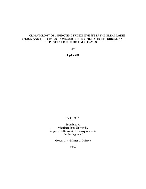 "Production of sour cherries has a significant impact on the economy of the Great Lakes Region, valued at more than $74 million. In contrast to cereal crops where water is the most limiting factor, perennials in temperate regions are limited by freeze injury, especially in the spring following initial phenological development, which was highlighted in 2002 and 2012 when yields decreased considerably. This study analyzed the spatial and temporal variability of springtime freeze events in the Great Lakes Region and their impact on sour cherry production, as well as explored the use of gridded climatic datasets. Additionally, this study examined the historical trends in sour cherry yield and potential future changes by the mid-century. The Great Lakes played a major role in the spatial variability of springtime freezes, as locations inland experienced colder temperatures than near the coast. Simulated damaging freeze events over the past 50 years were most common during the later phenological stages of the crop, while the most severe damage occurred in the earlier stages. Gridded datasets were less suitable for this application than individual station observations. Over time, phenological development has tended to begin earlier, and this trend was projected to continue into the mid-century at three stations located in northwest, west central, and southwest Lower Michigan. An ensemble of climate projections indicated a large uncertainty envelope surrounding changes in simulated sour cherry yield. The projected changes varied by emissions scenario, downscaling method, and climate model."--Page ii.
