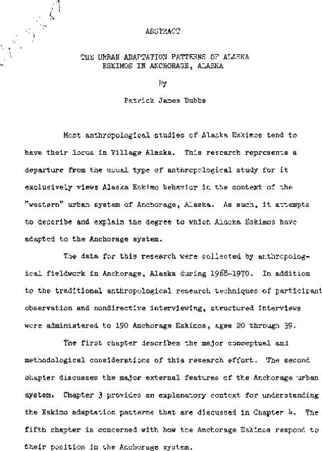 The urban adaptation patterns of Alaska Eskimos in Anchorage, Alaska